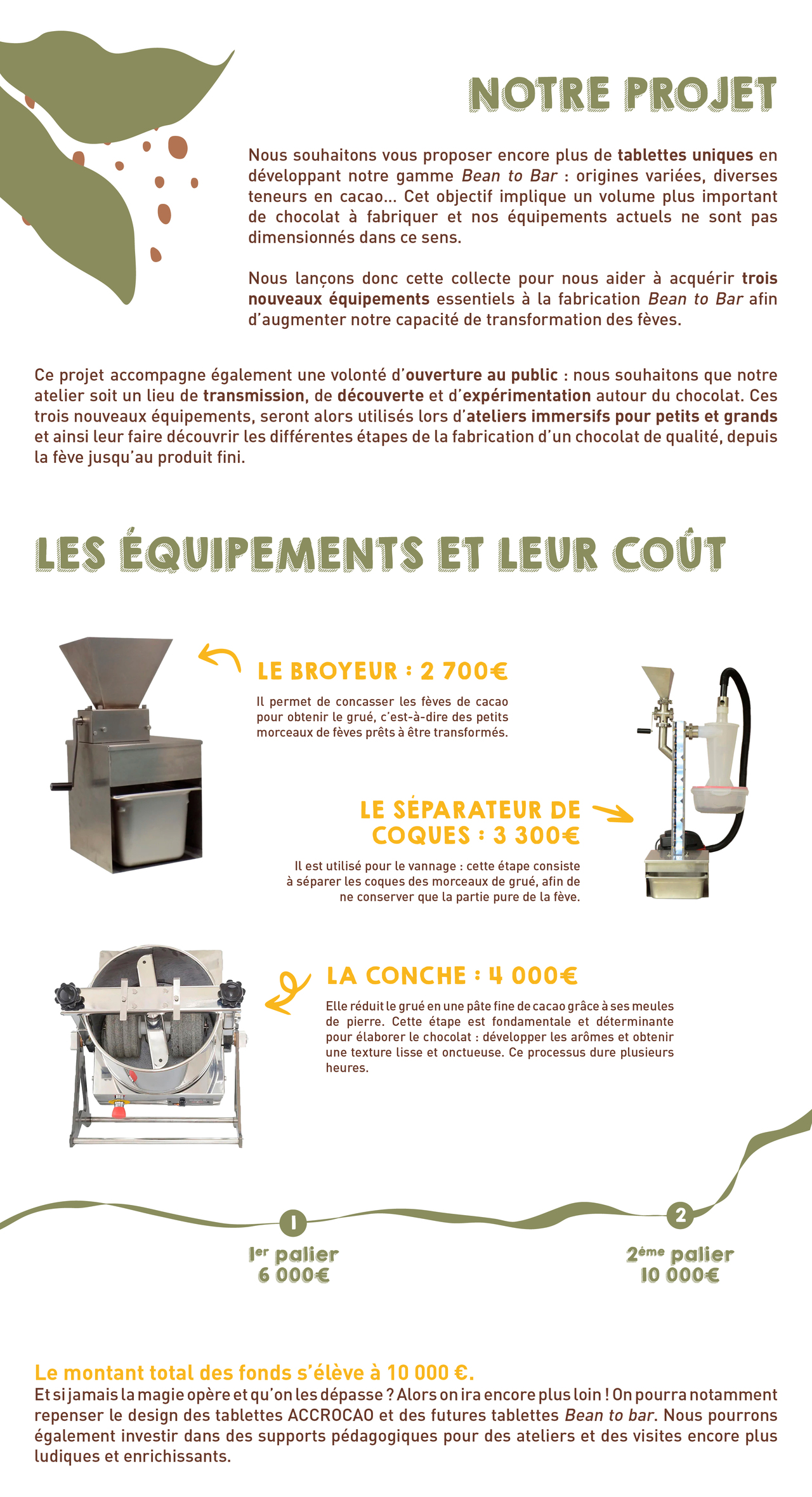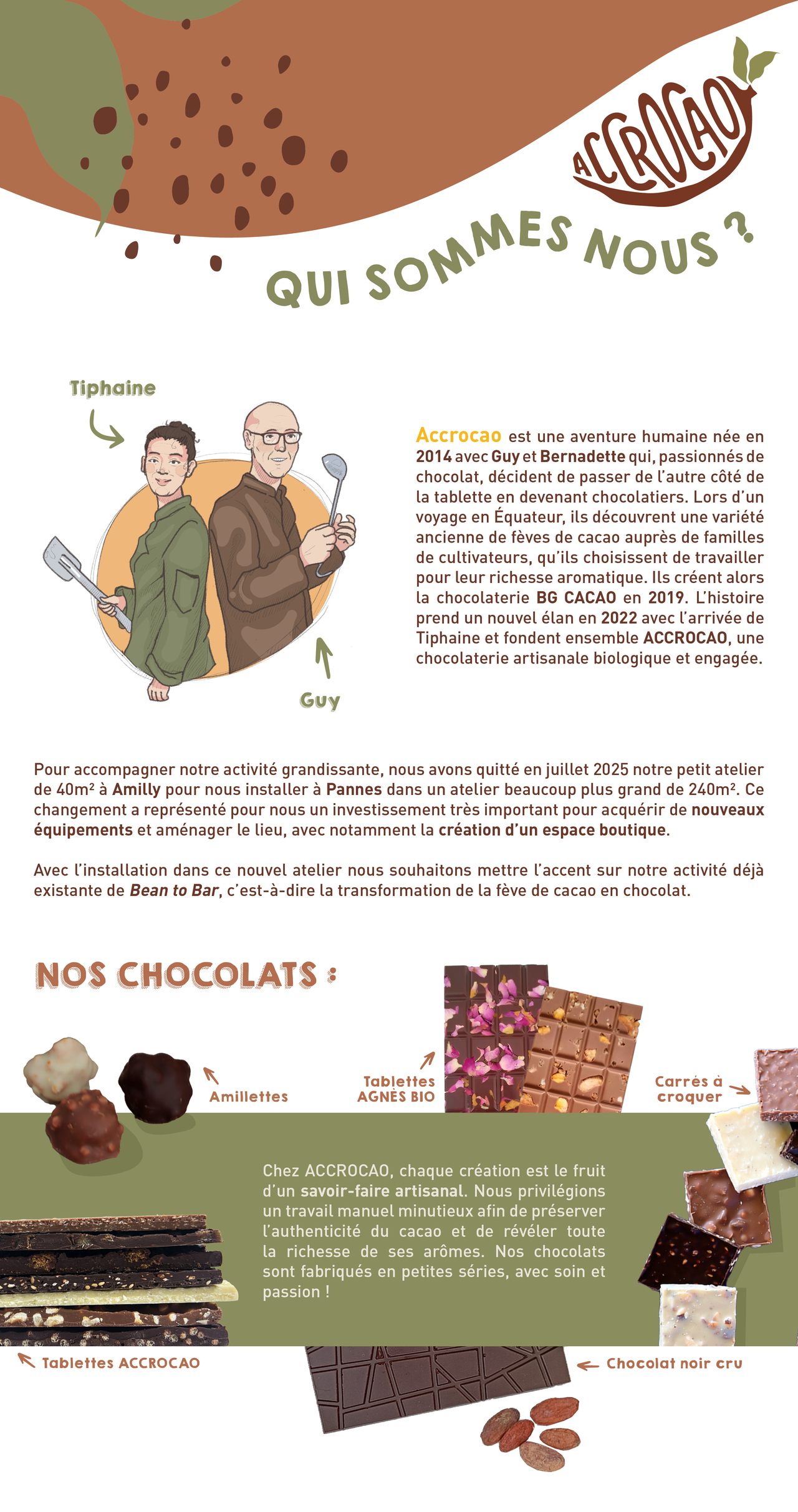 ACCROCAO est une petite entreprise situé à Pannes, dans le Loiret. Nous avons pour ambition de proposer un chocolat responsable, biologique et authentique. Notre travail s'inscrit dans une démarche artisanale, avec une attention particulière portée à l'origine des matières premières, à une production à petite échelle, en circuit court et à un savoir-faire qui préserve et révèle les arômes des fèves de cacao. Nous vous laissons découvrir plus en plus de détails notre projet de chocolat Bean to bar !