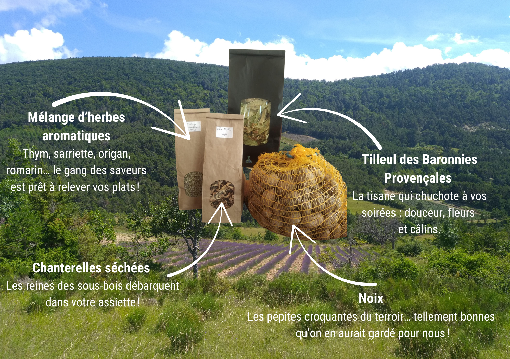 Ce coffret est un concentré de saveurs et d’arômes locaux, soigneusement sélectionnés pour sublimer vos recettes et moments de détente : - Chanterelles séchées (50 g) : Offrez une touche forestière à vos plats avec ces champignons au goût délicat et raffiné. - Tilleul des Baronnies Provençales (40 g) : Une infusion douce et apaisante, parfaite pour vos soirées cocooning. - Mélange d’herbes aromatiques (150 g) : Thym, sarriette, origan, romarin… un quatuor aromatique irrésistible, issu de cueillettes locales et de partenariats avec des producteurs bio, en attendant nos premières récoltes. - Noix (1 kg) : Croquantes, savoureuses et 100 % locales, elles raviront vos papilles… jusqu’à épuisement des stocks ! (Récolte chez un ancien producteur local). Disponibilité : Livraison sous 15 jours après la fin de la collecte (dans la limite des stocks pour les noix). Ce coffret réunit le meilleur des Baronnies pour éveiller vos papilles ! 💚