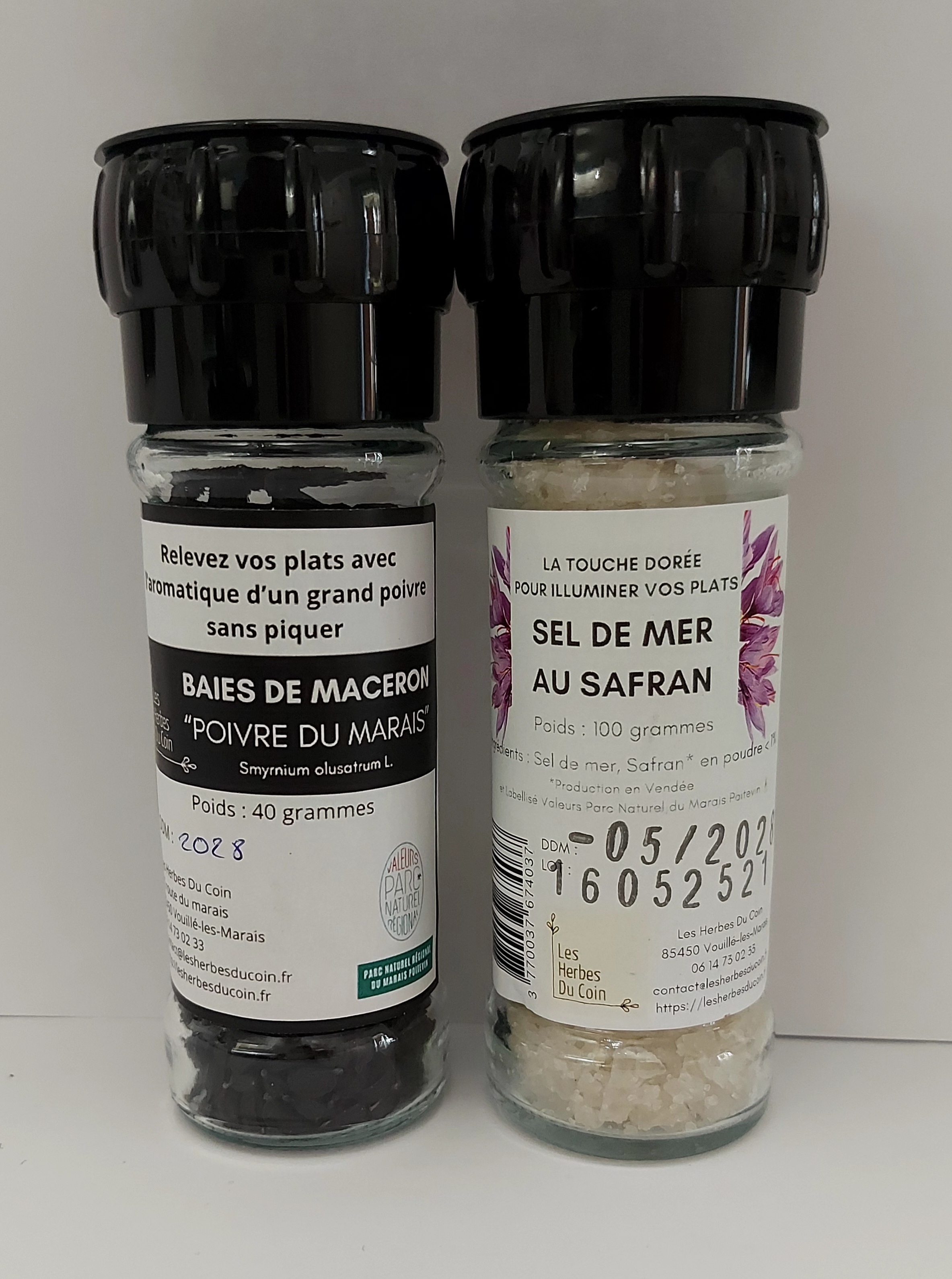 - 1 moulin de sel de mer au safran - 1 moulin de baies de maceron à mettre dans toutes les assiettes ! Le sel au safran vous permet de moins saler car vous avez 2 exhausteurs de goût en 1. Le maceron relève le goût de vos assiettes comme un poivre mais sans piquer, avec des vertus digestives !
