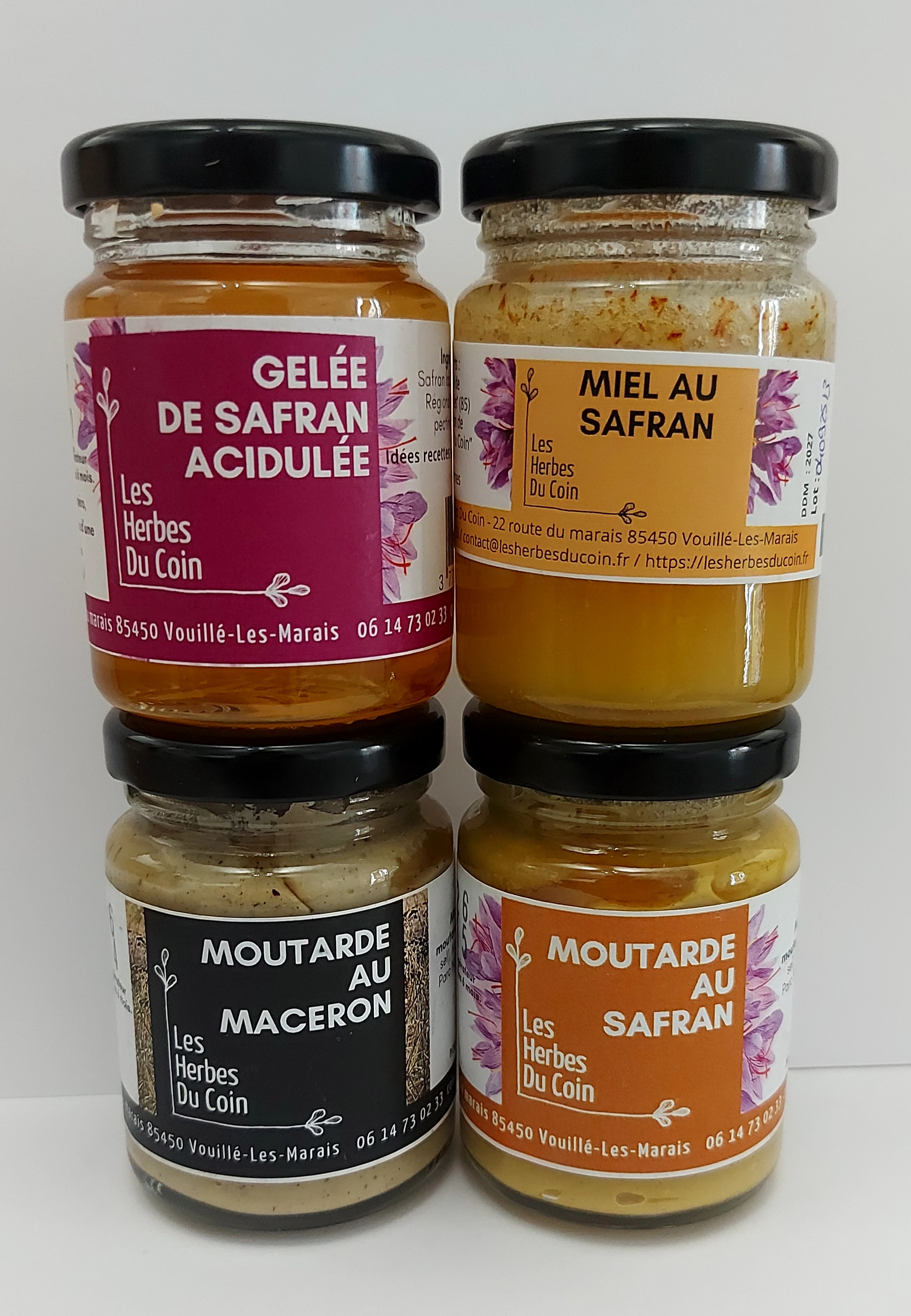 - 1 gelée de safran acidulée ( à mettre sur le foie gras, les fromages à l'apéro, pour déglacer les viandes, dans les marinades et les vinaigrettes. - 1 moutarde au safran, naturellement douce sans sucre ajouté - 1 moutarde au maceron, relevée et parfumée - 1 miel au safran, pour vos recettes sucrées-salées, vos desserts ou pour profiter des vertus du safran de façon gourmande. - 3 recettes exclusives à faire avec ces pots !