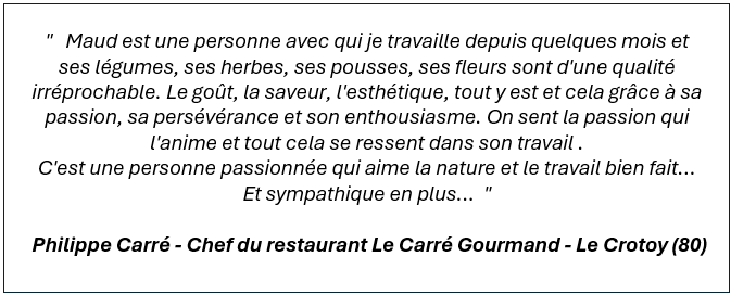 Je suis Maud, j’ai 49 ans, un amoureux qui partage ma vie, une famille et des amis essentiels à mon équilibre, des chats, des chiens, des poules, des ânes, et des millions de petites bêtes très utiles dans ma ferme située à Argoules dans la Somme. J'y produis, en agriculture biologique, des légumes, des micropousses, des plantes aromatiques, des fleurs comestibles et bientôt des œufs de pâturage et du pain au levain cuit au feu de bois !