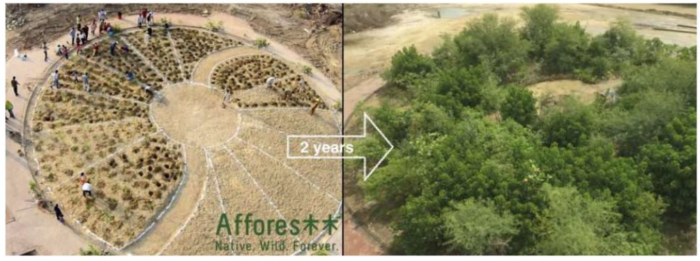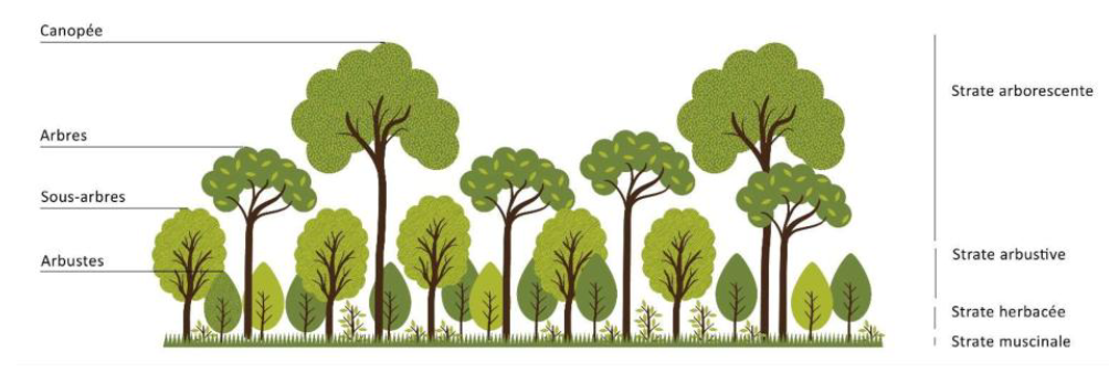 La méthode Miyawaki consiste en une plantation dense (3 plants/m²), variée, respectant les strates naturelles d’une forêt.