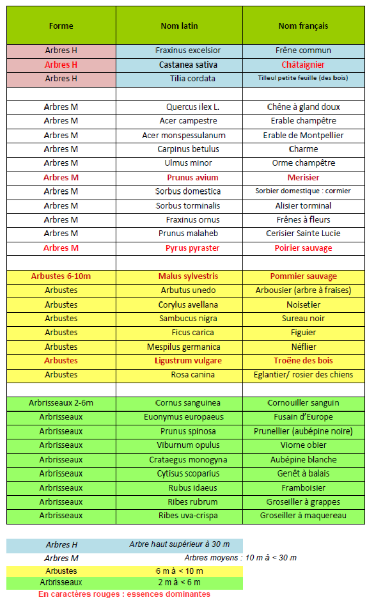 Essences sélectionnées pour le projet que j'ai choisi à dominante "fruitière" :