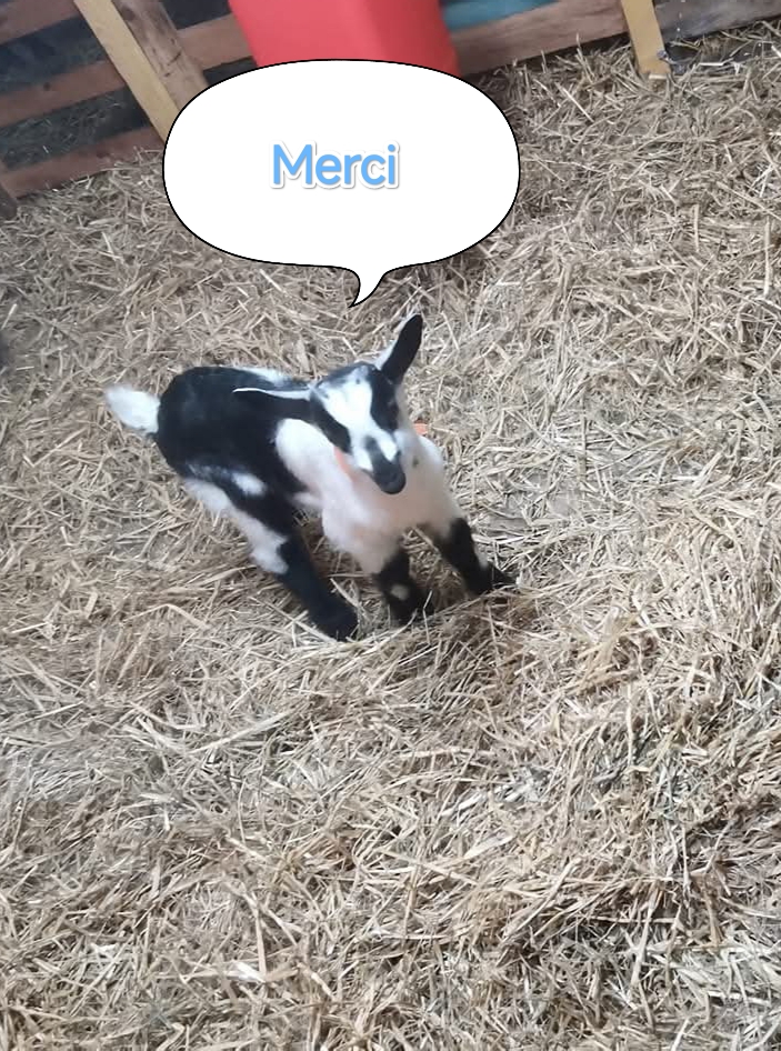 Un grand merci. Le parrainage d'une chevrette. Remise d'un certificat personnalisé avec le choix de son nom (suivant la liste ), des photos de son évolution de la chèvre parrainée. Ainsi que le stylo pour vos plus belles signatures. Une visite de la ferme sera organisée spécialement pour les parrains et marraines. Cela permettra de rencontrer les animaux et de voir directement l'impact de votre soutien au sein de la chevrerie.