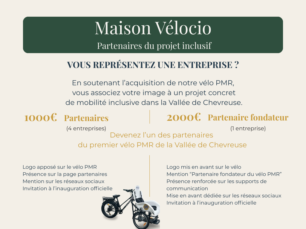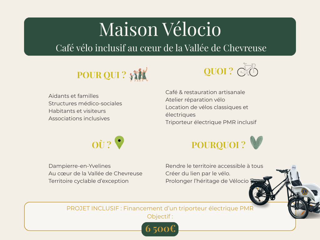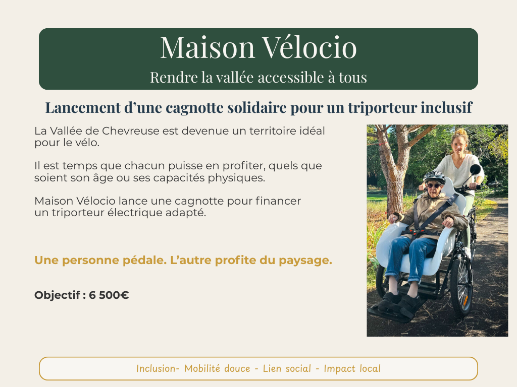 Financer un vélo électrique PMR pour rendre la Vallée de Chevreuse accessible à tous, au départ du café-vélo Maison Vélocio. 🚲🌿