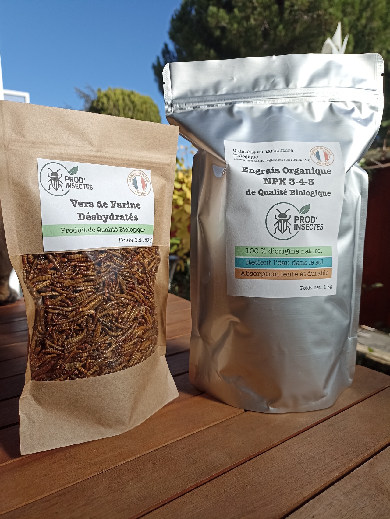 Un sac de 1 kg d'engrais biologique Un sachet de 100 g de vers de farine déshydratés
