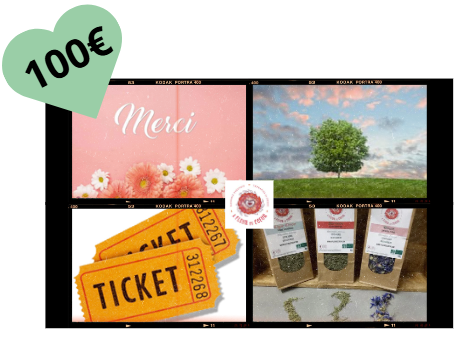 un grand Merci + parrainage de l'arbre de votre choix avec affichage de votre prénom auprès de celui-ci et sur un support dédié qui sera affiché à la ferme + un atelier découverte "Reliance " cueillette, cuisine, connexion au végétal, relaxation sur deux jours complets (hors hébergement) pour 2 personnes à partir du printemps 2025