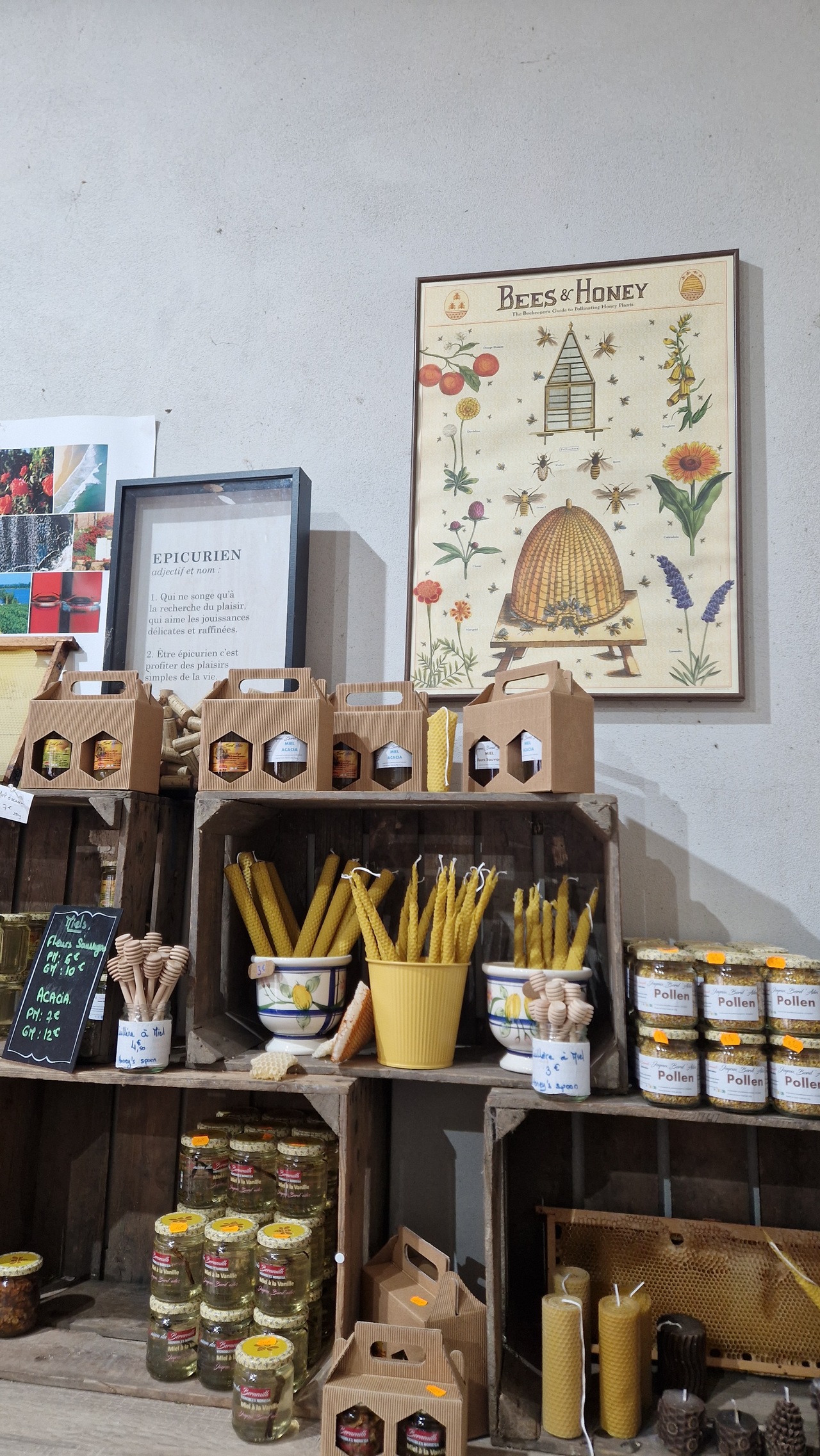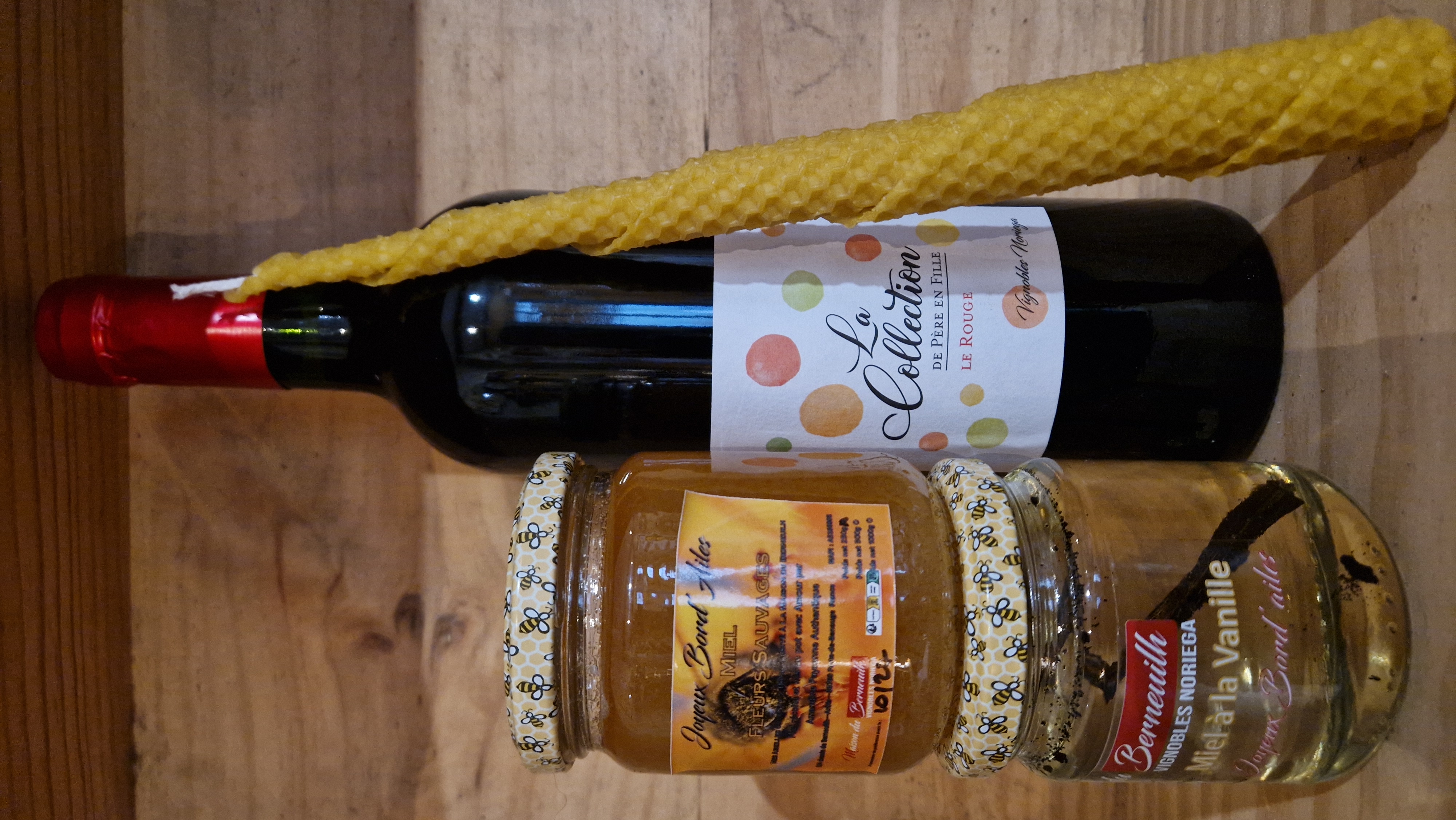 Un concentré de la Ferme : 1 pot de miel 1 pot de gourmandises au miel 1 bouteille de vinaigre 1 bouteille de vin rouge 1 bouteille de vin blanc
