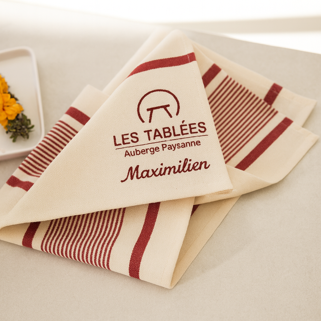 Set de 2 serviettes brodées avec le prénom et le logo des Tablées, en coton biologique et brodées localement ! + un verre offert* + votre nom affiché dans le restaurant + une invitation à notre soirée pré-ouverture ! Photo non-contractuelle