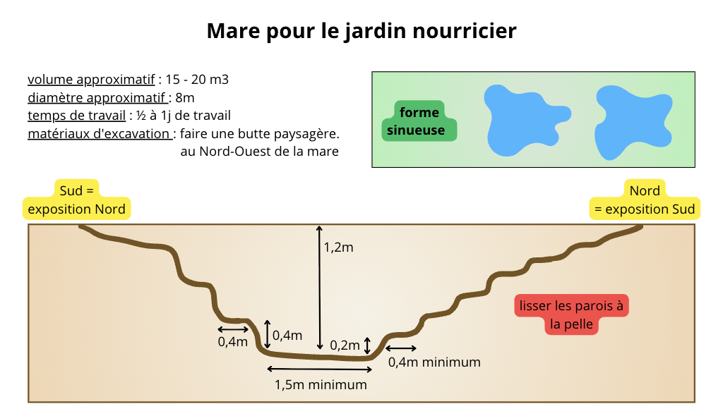 - Palier 1 - 2200 € : Préparation du sol et création d'une mare. Nous faisons appel à un agriculteur local (merci Aymeric !) pour préparer le terrain à la mini-pelle et au tracteur. C'est le seul moment où nous utilisons des machines — et franchement, c'est salvateur pour notre intégrité physique ! Nous en profitons pour creuser une mare, véritable alliée de la biodiversité : habitat, refuge et zone de reproduction pour insectes, amphibiens, reptiles et oiseaux.