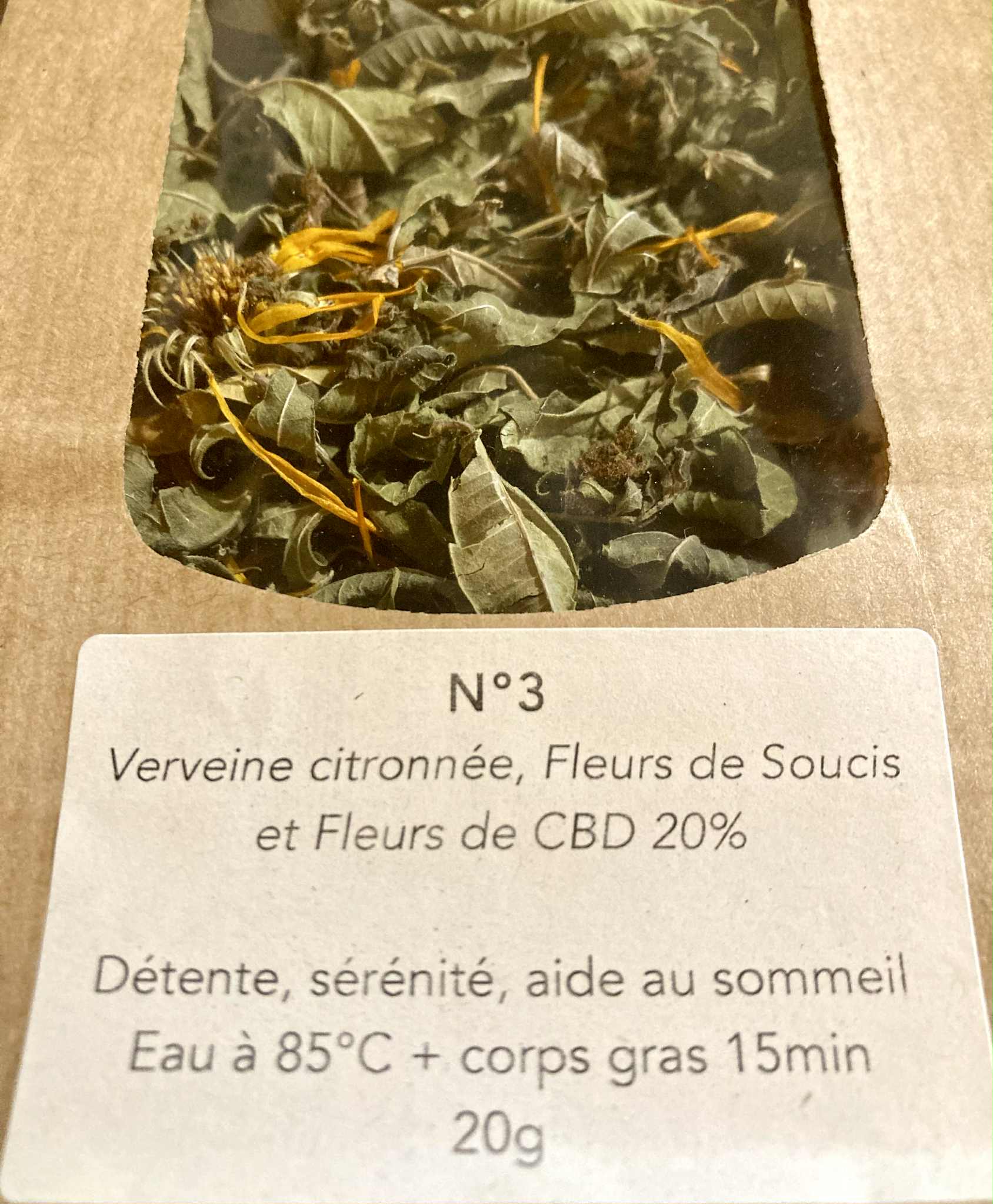 Un sachet de tisane sans CBD dans la gamme disponible, selon les stocks