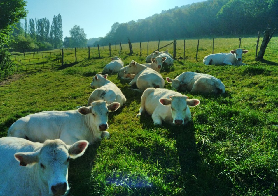 À la ferme, nous élevons des vaches de race Charolaise (50 mères et un taureau), des poulets de plein air Label rouge (quatres bâtiments dont trois ont été construits par mes parents), et des cultures céréalières dans le respect des animaux et de la terre.