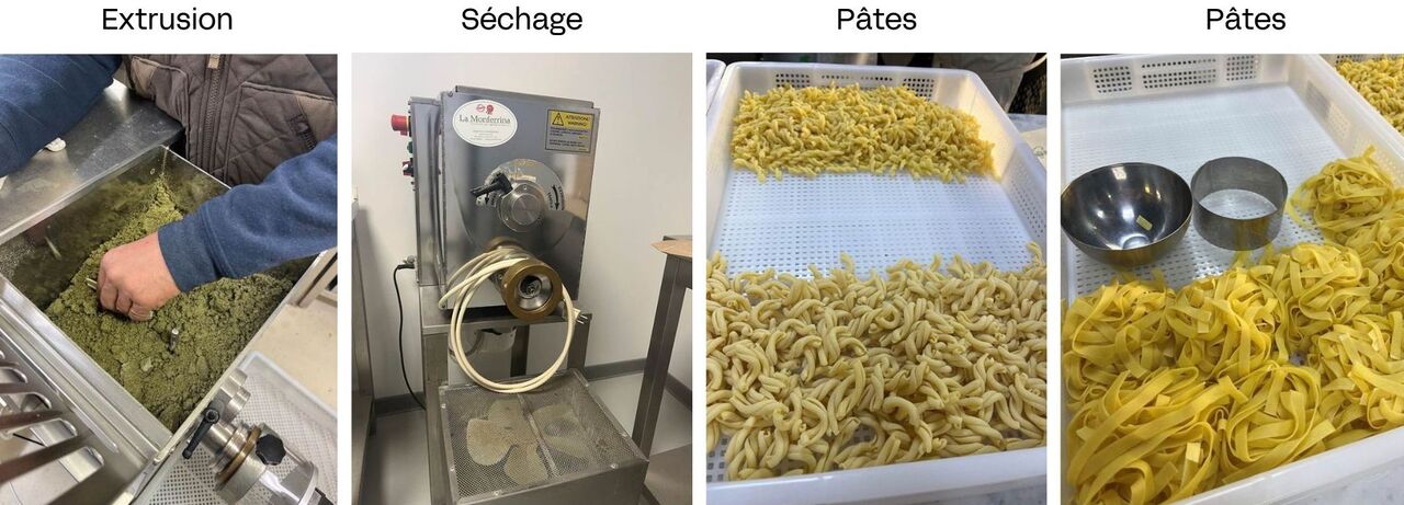 L’extrusion consiste à écraser notre mélange, qui a alors un aspect de pâte à « crumble », le long d’une vis sans fin pour sortir dans une filière qui va lui donner la forme de la pâte. Selon la forme voulue, nous changeons la filière.
