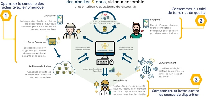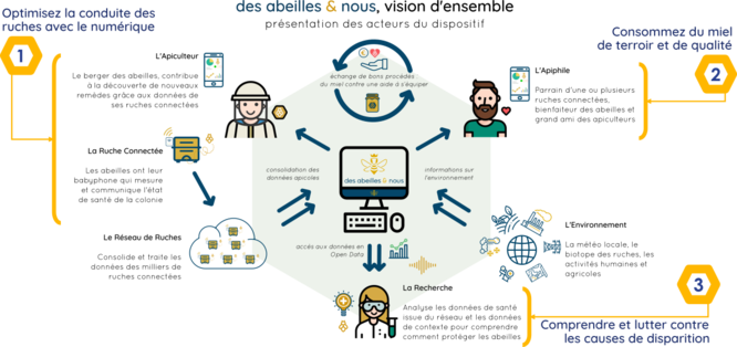 « des abeilles & nous » est une plateforme participative pour la préservation des abeilles et l'aide à l'apiculture grâce au numérique. Nous mettons en relation apiculteurs, particuliers et scientifiques autour d'un projet commun en faveur de la préservation des abeilles : la mise en place à l'échelle du territoire d'un réseau de 15 000 ruches connectées qui permettront d'analyser et de mieux comprendre, à grande échelle, l'influence des différents facteurs environnementaux (climat, activités humaines, frelons...) sur l'état de santé des colonies d'abeilles
