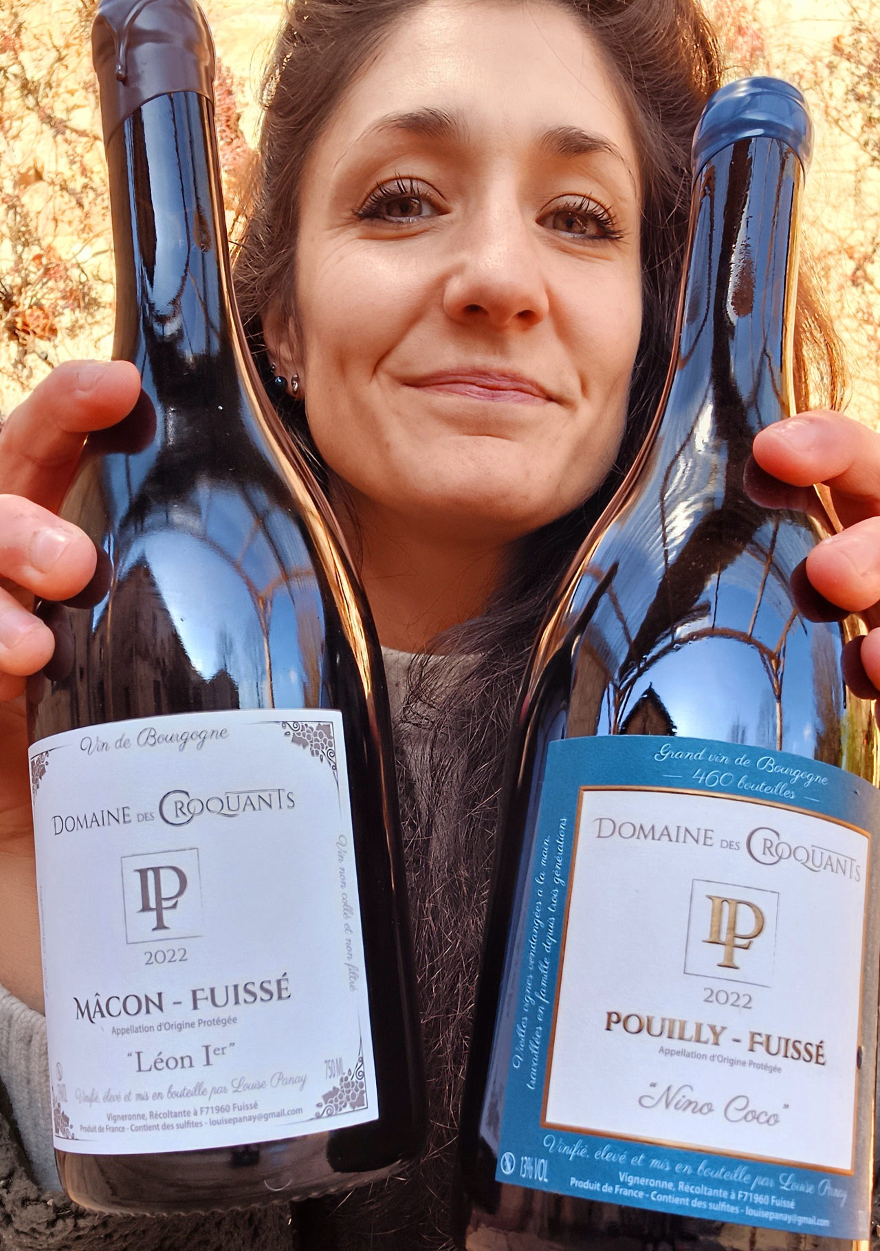 Je suis Louise Panay, vigneronne à Fuissé (71) et j'ai créé le Domaine des Croquants en 2020. Il s'agit d'un domaine viticole d'environ 6 hectares, composé de vignes que travaillaient ma famille depuis plusieurs générations.