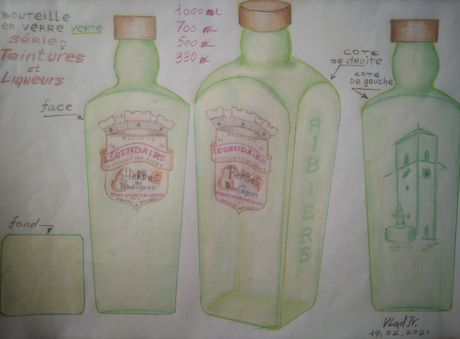 Un croquis du design de la bouteille avec gravure individuelle utilisant des éléments d'architecture et d'héraldique de la commune de Val Buëch-Méouge