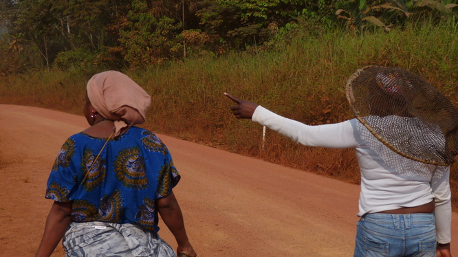 La forêt environnante où se tient le projet s’étend sur 3km linéaire en bordure de piste en latérite, et s’enfonce sur environ 13 km dans la jungle.