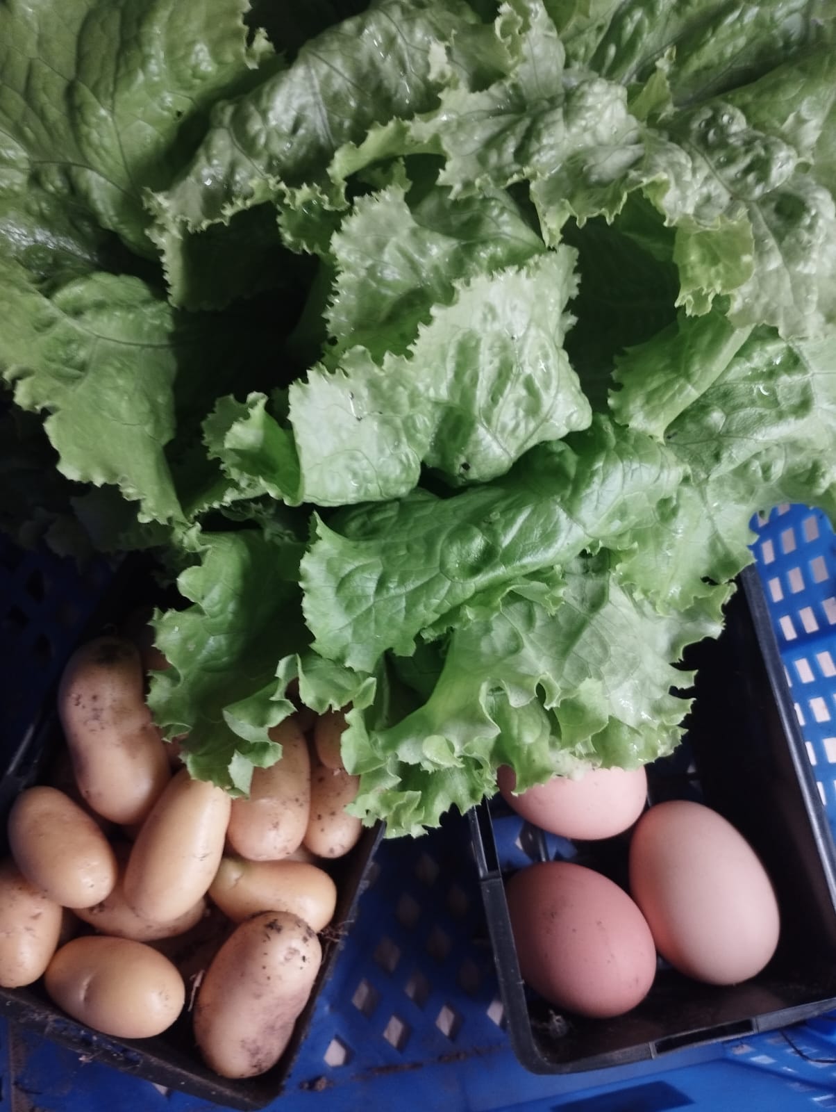 Pour 25 euros, 1 boite de 12 œufs et un panier de légumes du moment.