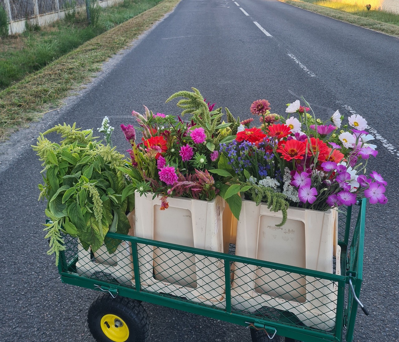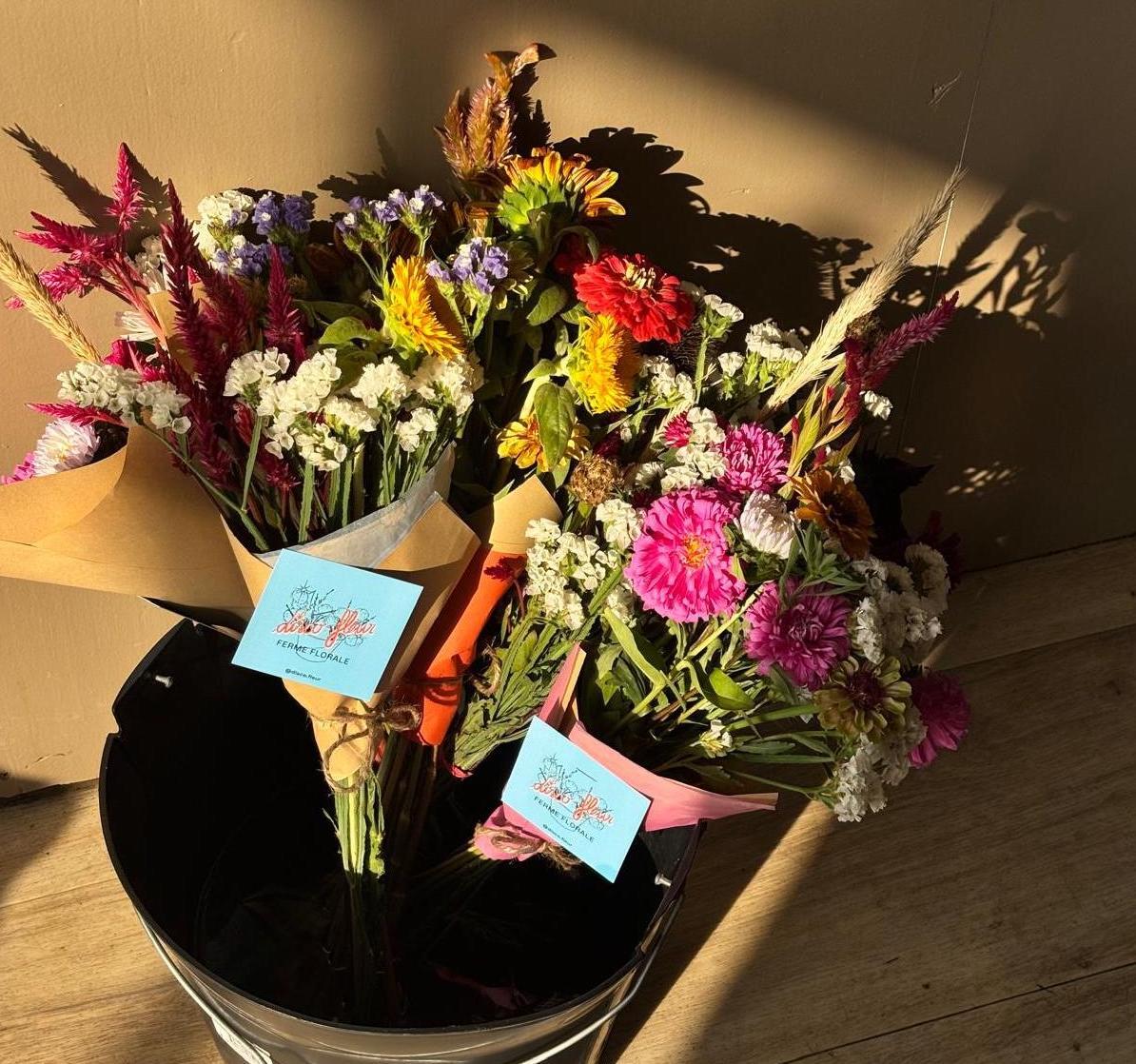 Pour la saison à venir, j’espère obtenir un emplacement au marché de Montalivet, que je me réjouirais d’investir avec mes bouquets disco(f)lorés. Toujours plus de fleurs, chez vous — grâce à vous.