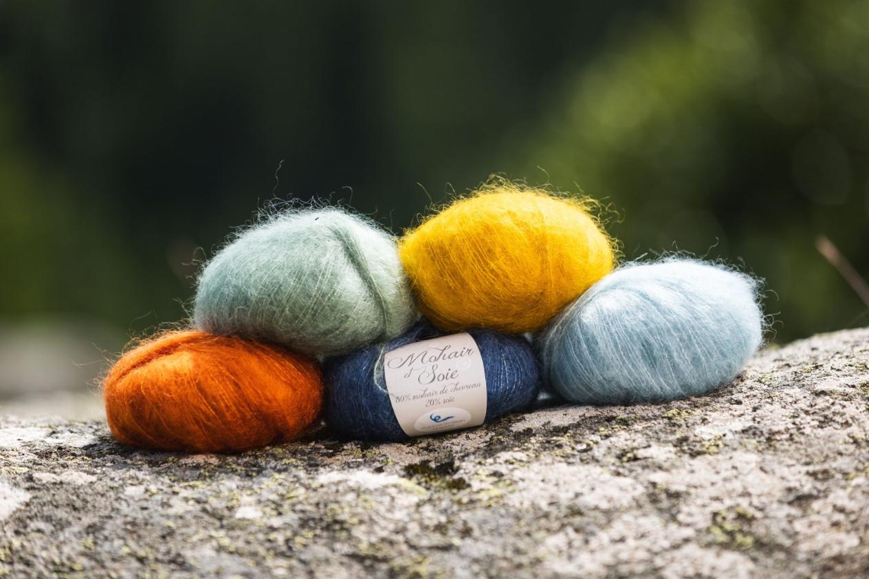Des pelotes de laine Mohair et en soie, des chaussettes pur Mohair, des écharpes tissées en Mohair et en soie, des ponchos tricotés, des plaids tissés Pur Mohair.