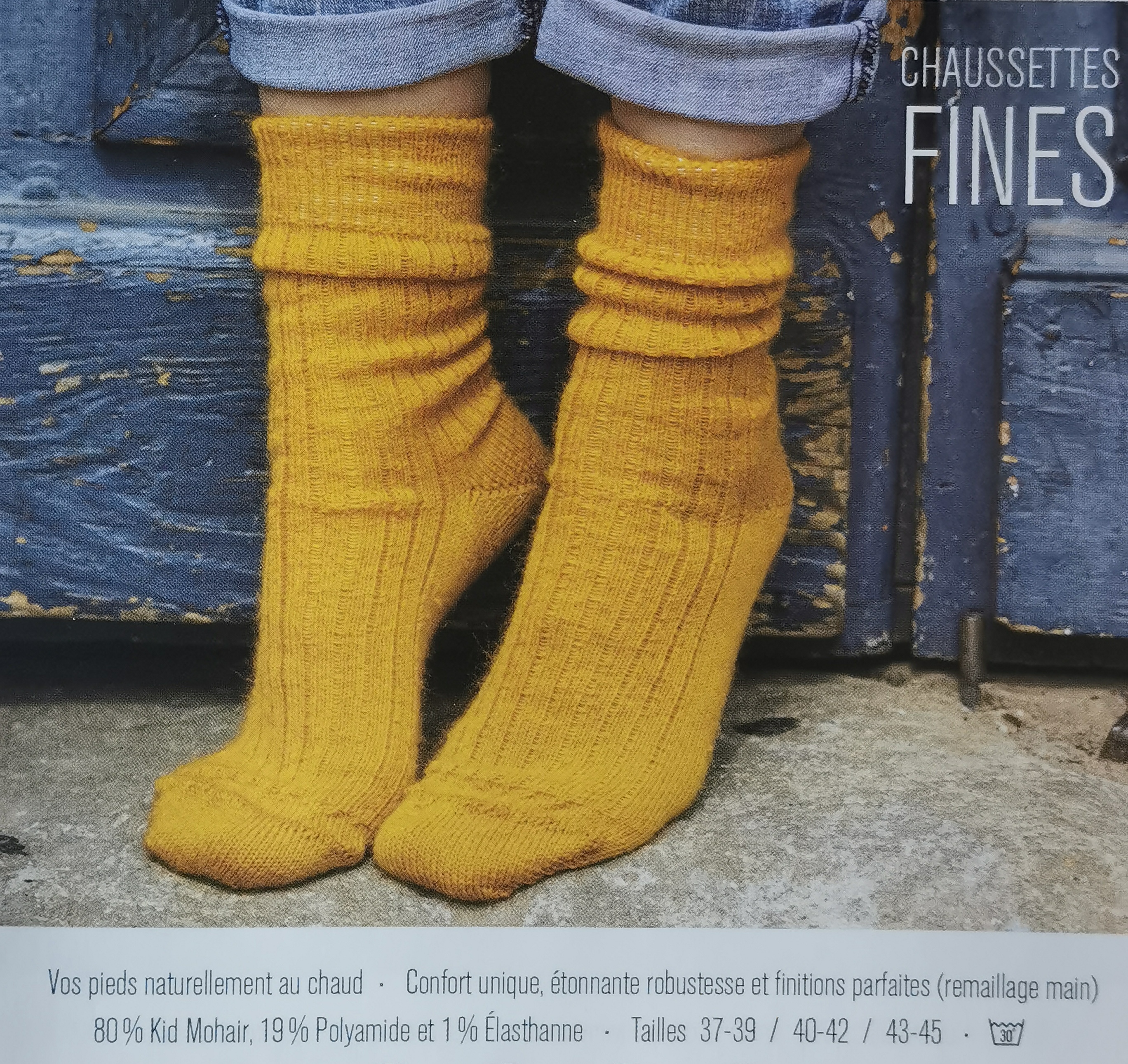 Ces chaussettes courtes (mi-mollet) vous apporteront confort et chaleur et vous les montrerez tellement les couleurs sont attrayantes ! 80 % Mohair, 19 % polyamide, 1 élasthanne Lavage à 30° Déclinées dans les tailles suivantes : - 34/36 - 37/39 - 40/42 - 43/45 - 46/48 Le stock évolue, pour connaître les disponibilités au moment de votre commande, contactez-moi par mail à : gog-ane@orange.fr et je vous enverrai les couleurs disponibles par taille.