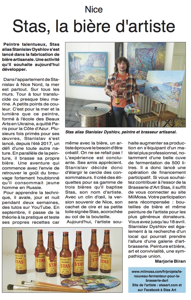 Un immense merci ! Remerciements sur ma page Facebook + ma gratitude à vie + 30 bouteilles de 33cl de bière d'artiste STAS au choix (Pale Ale ou Turbo-Munich) + 6 Bouteilles de 75cl Bière de souvenir avec cire à cacheter autour du goulot de la bouteille + 4 sous-bocks STAS + 1 tableau d'artiste, huile sur toile, 24x30cm, signé, 2017, original + carte de réduction pour bière -15% à vie ! À choisir préalablement sur mon site ou à choisir sur place en atelier. Livraison possible à vos frais.