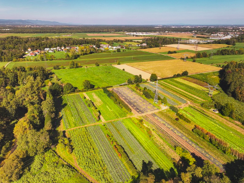 - 6,5 hectare de plein champ à Reiningue (terrain de Mulhouse Alsace Agglomération) dédiés aux cultures qui demandent de l'espace (choux, poireaux, courges, légumes de conservation,...), plus d'1km de haies et arbres fruitiers.