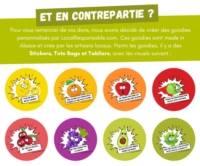 - Remerciement sur les Réseaux sociaux - Sticker magnétique personnalisé - Tablier personnalisé MADE IN FRANCE - Tee shirt personnalisé MADE IN FRANCE - Tote Bag personnalisé MADE IN FRANCE - Carte cadeau de 100€ - Nom gravé sur le mur des grands donateurs qui sera affiché pour TOUJOURS sur LocalResponsable.com