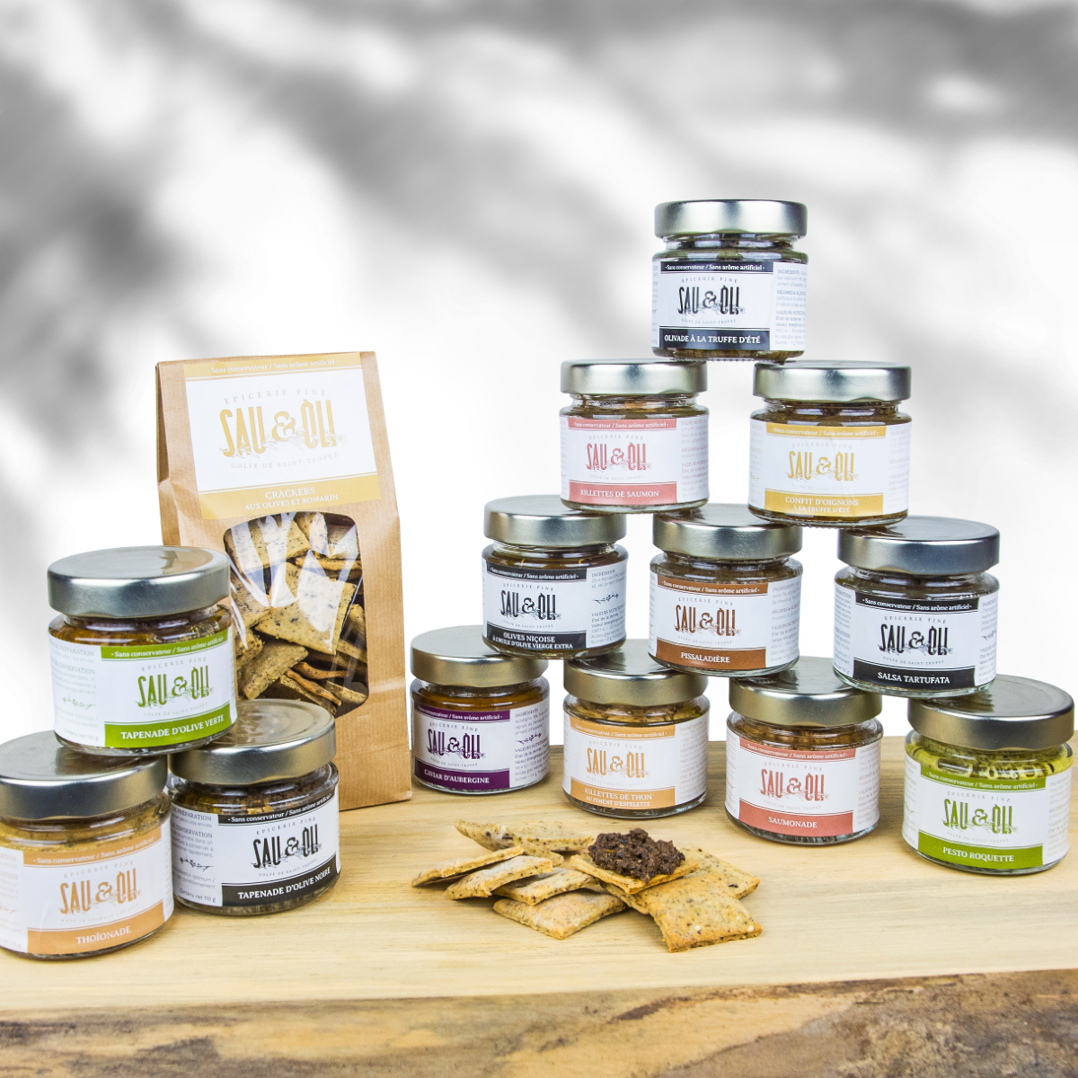 13 de nos produits et nos fameux crackers 1 tapenade d'olive verte 1 tapenade d'olive noire 1 thoïonade 1 saumonade 1 olivade à la truffe 1 pesto roquette 1 confit d'oignon à la truffe 1 pissaladière 1 rillettes de thon 1 rillettes de saumon 1 olives Niçoise 1 salsa tartufata 1 caviar d'aubergine 1 Crackers olives et romarin
