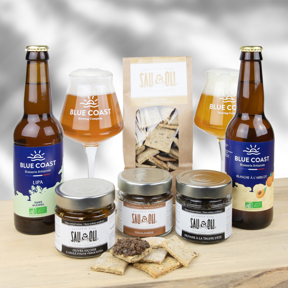 2 bières artisanales de notre Brasseur et 3 de nos produits spécialité Niçoise 1 tapenade d'olives noires 1 pissaladière 1 olives Niçoise à l'huile d'olive
