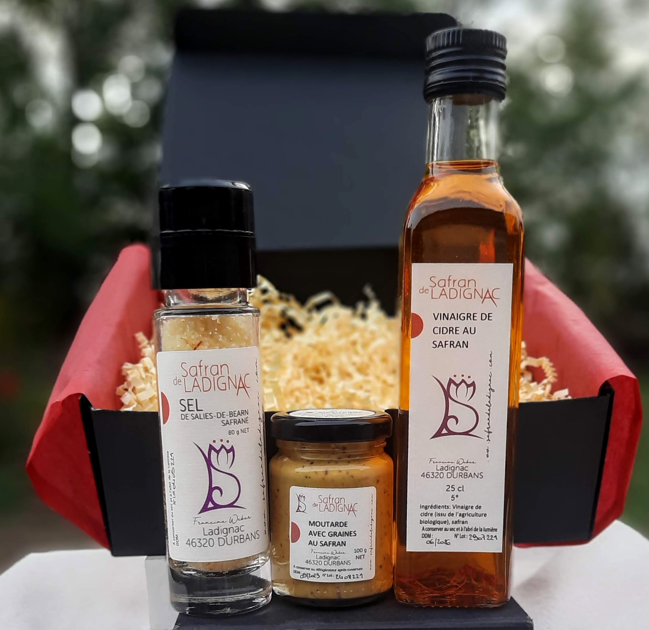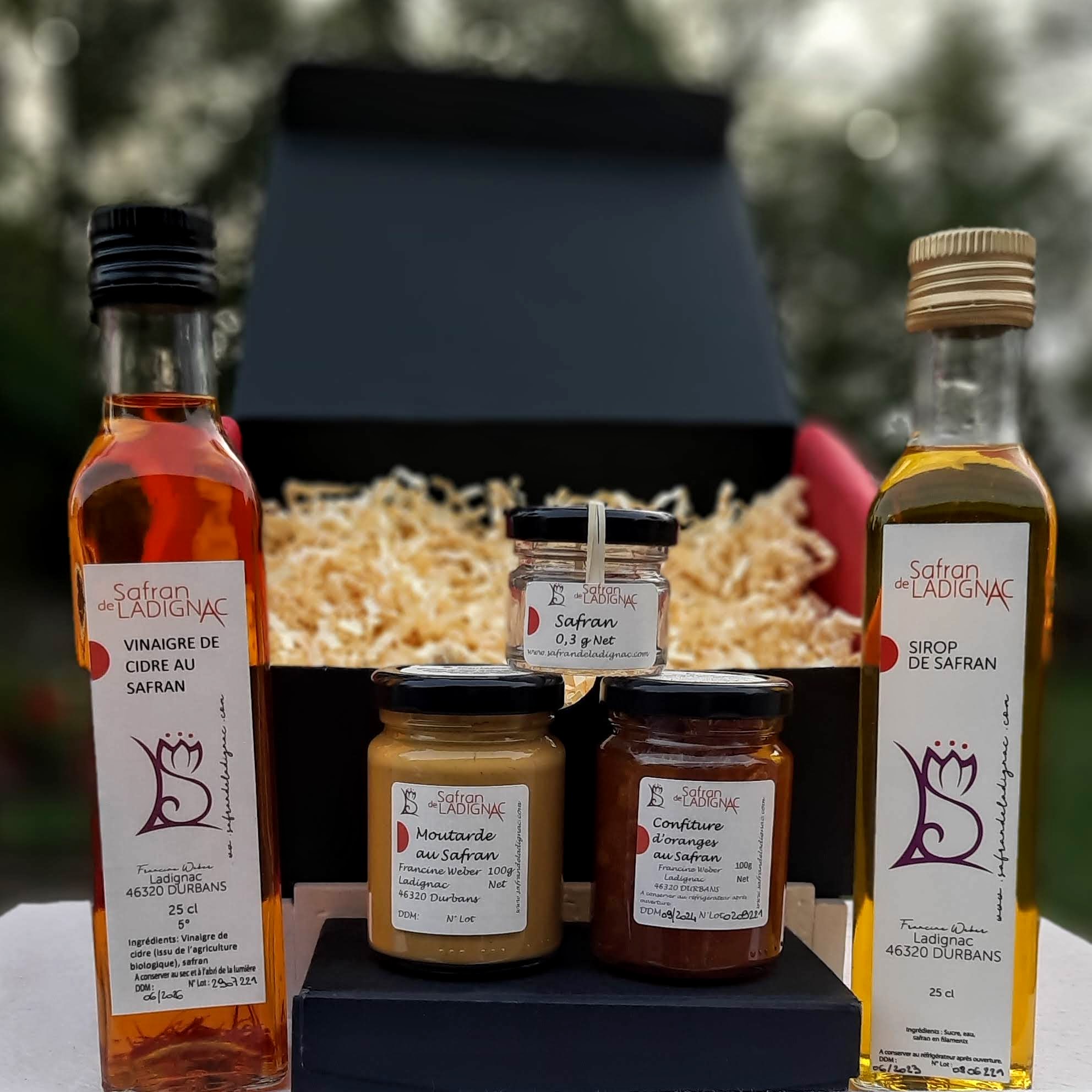 Coffret composé de : Un pot de safran du Quercy 0.3g Un pot de moutarde au safran 100g Un pot de confiture d'oranges au safran 100g Une bouteille de vinaigre de cidre (bio) au safran 25cl Une bouteille de sirop de safran 25cl * frais de port inclus *