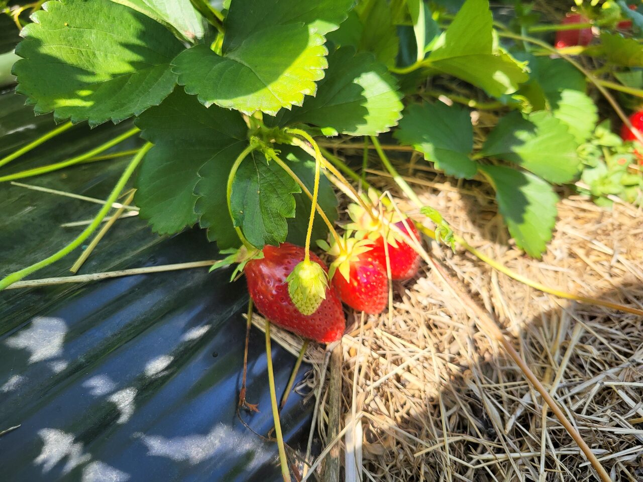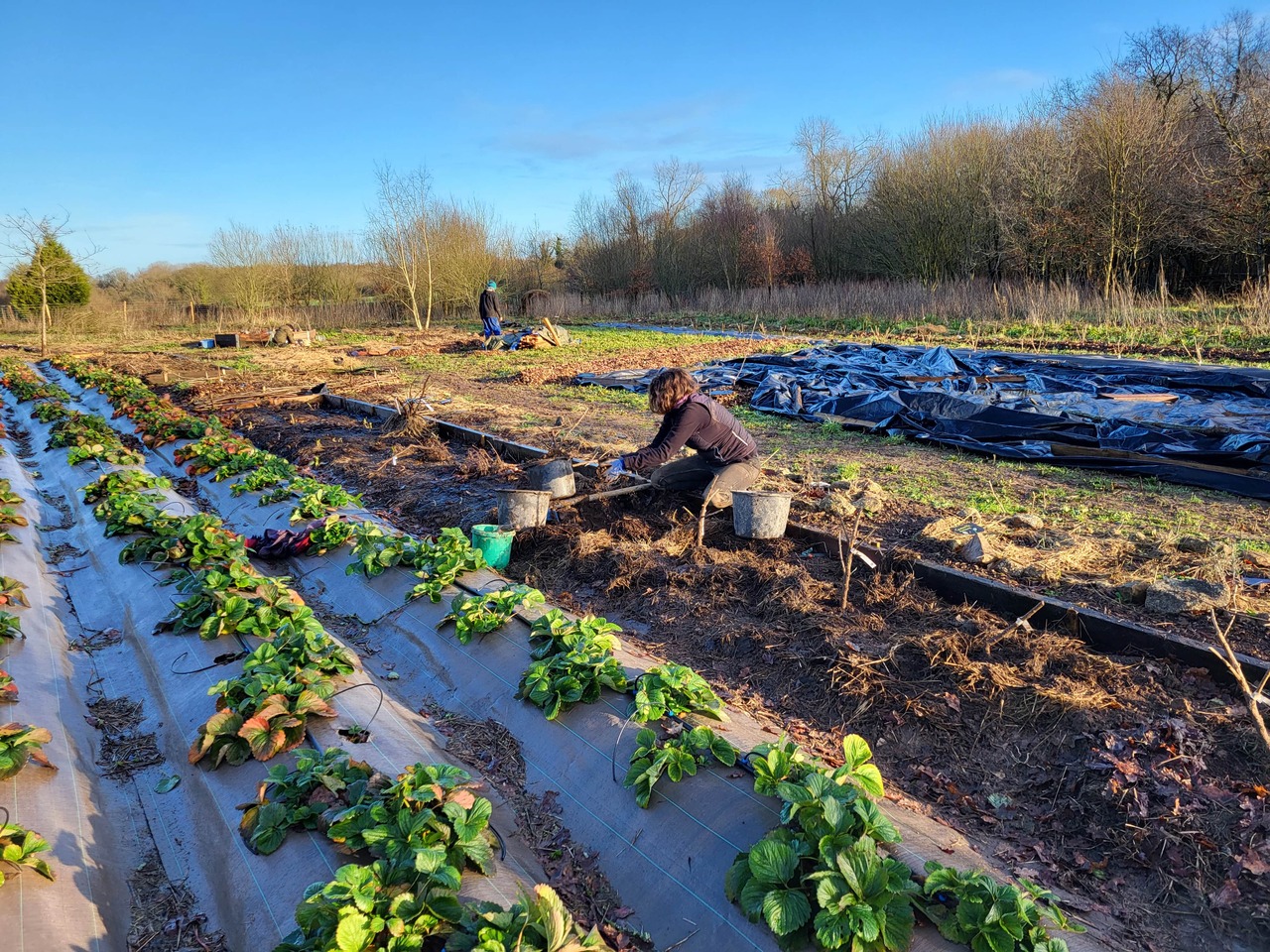 En juillet 2025, nous avons implanté notre fraiseraie : 680 fraisiers plantés à la main. À leurs côtés :