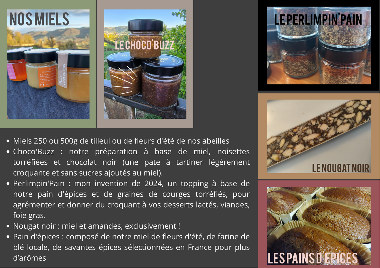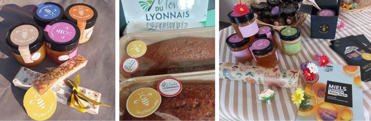 Nos productions sont labellisées "Monts du Lyonnais, terre de saveurs" ou en partenariat au féminin avec d'autres amies productrices. Les abeilles sont de race Noire (abeille endémique plus résistante et frugale). Toutes nos matières 1° sont sourcées au plus proche, en France ou dans notre région, autant que possible (y compris les pots de miel en verre, lyonnais !).