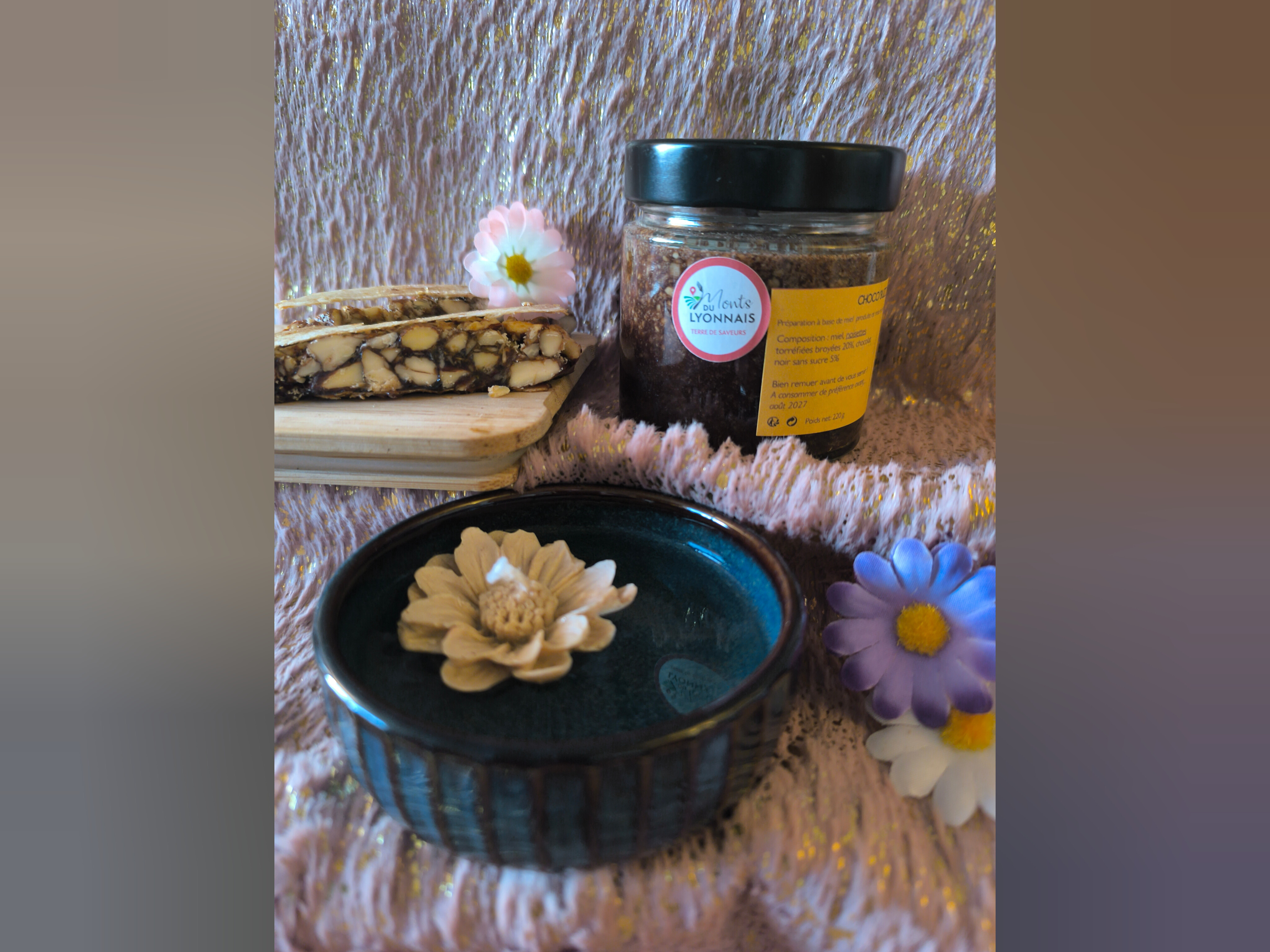 Un petit cadeau plein de gourmandise : Choco’Buzz 125 g, un nougat noir 50g et une délicate bougie fleur flottante — parfait pour découvrir le goût vrai de la ruche en douceur.