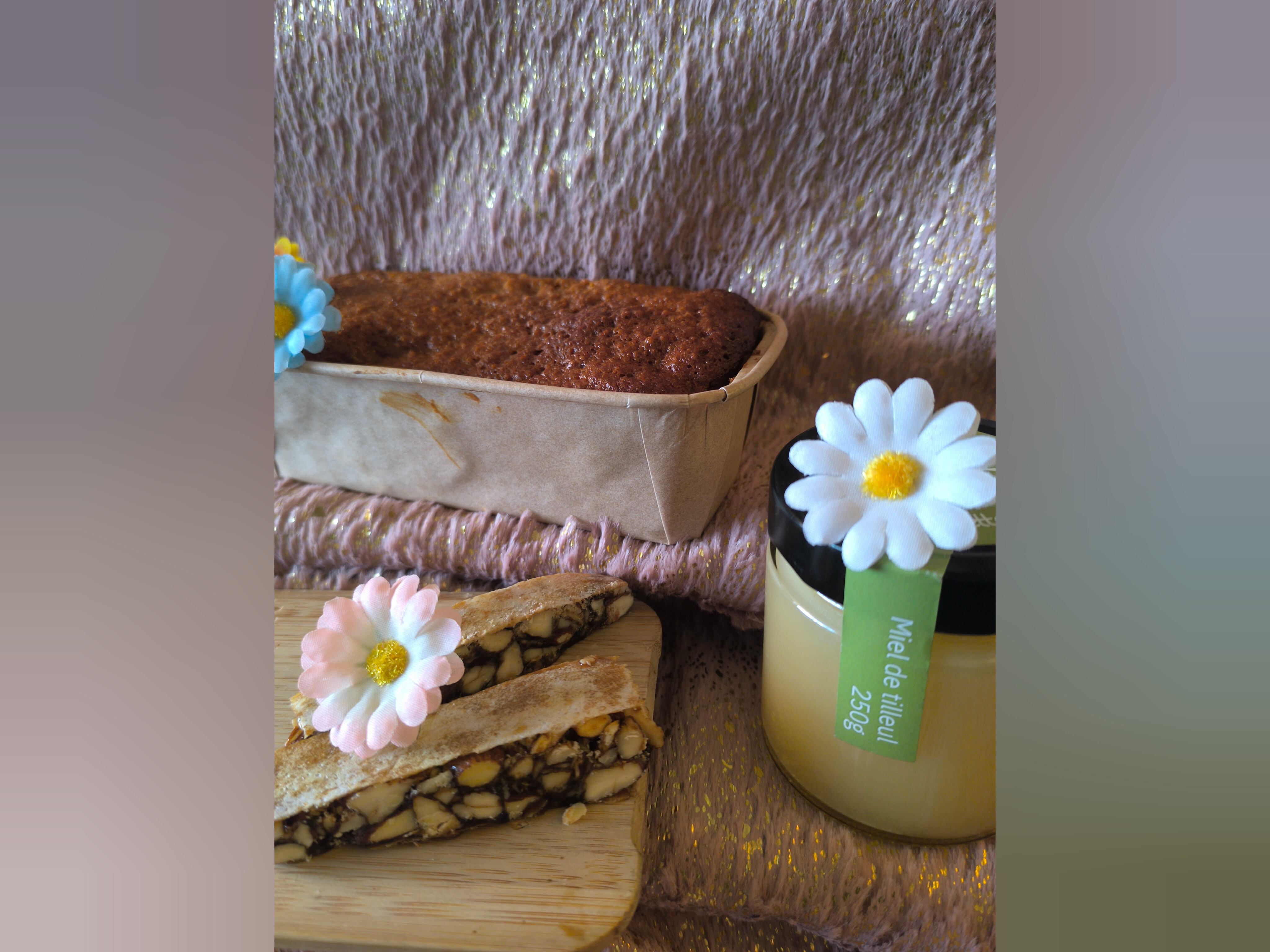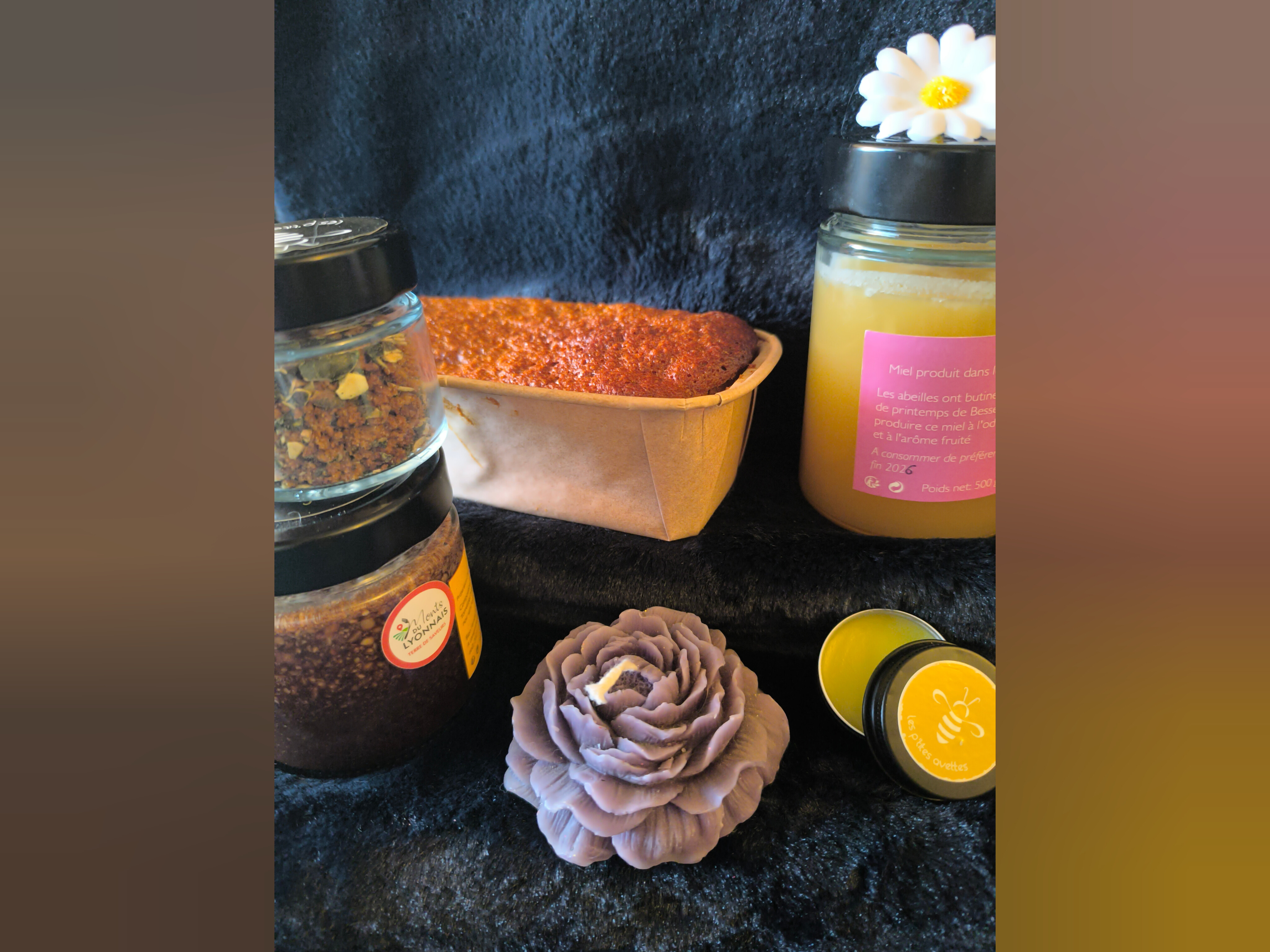 Généreux et élégant : miel 500 g, pain d’épices, Choco’Buzz 230g, topping Perlimpin'Pain et un baume, avec une grande bougie fleurie (rose ou pivoine) pour créer l’ambiance — un cadeau qui en impose.