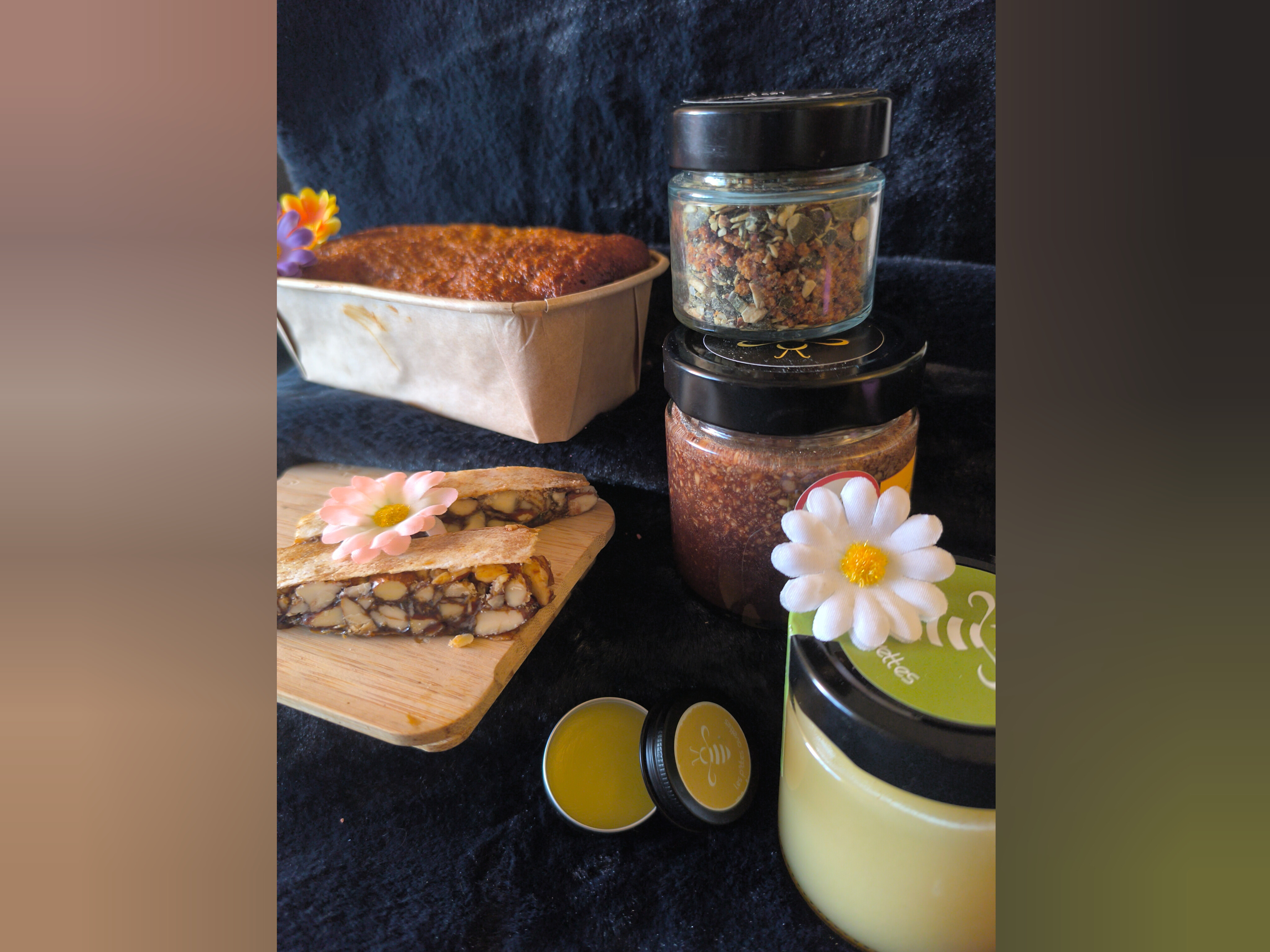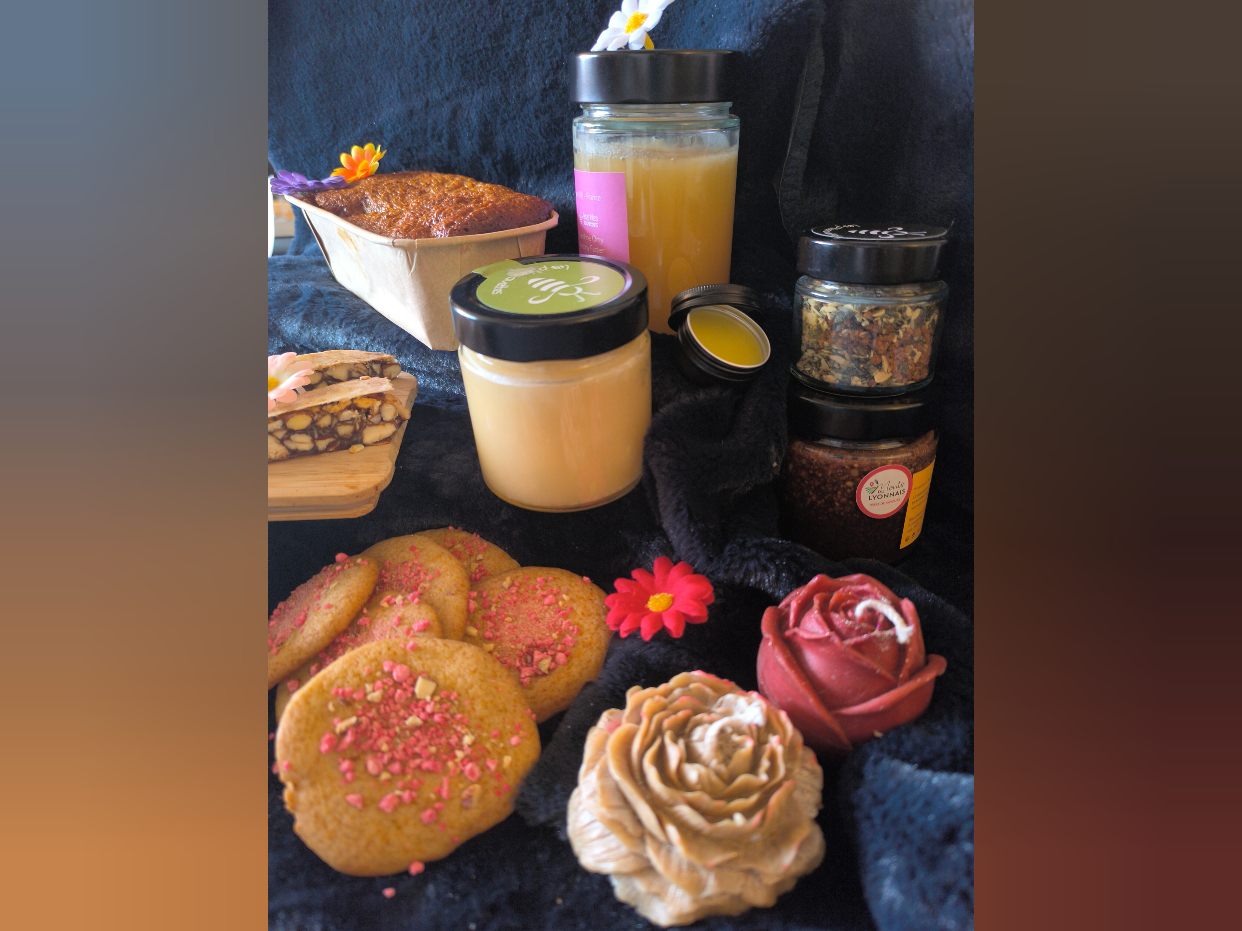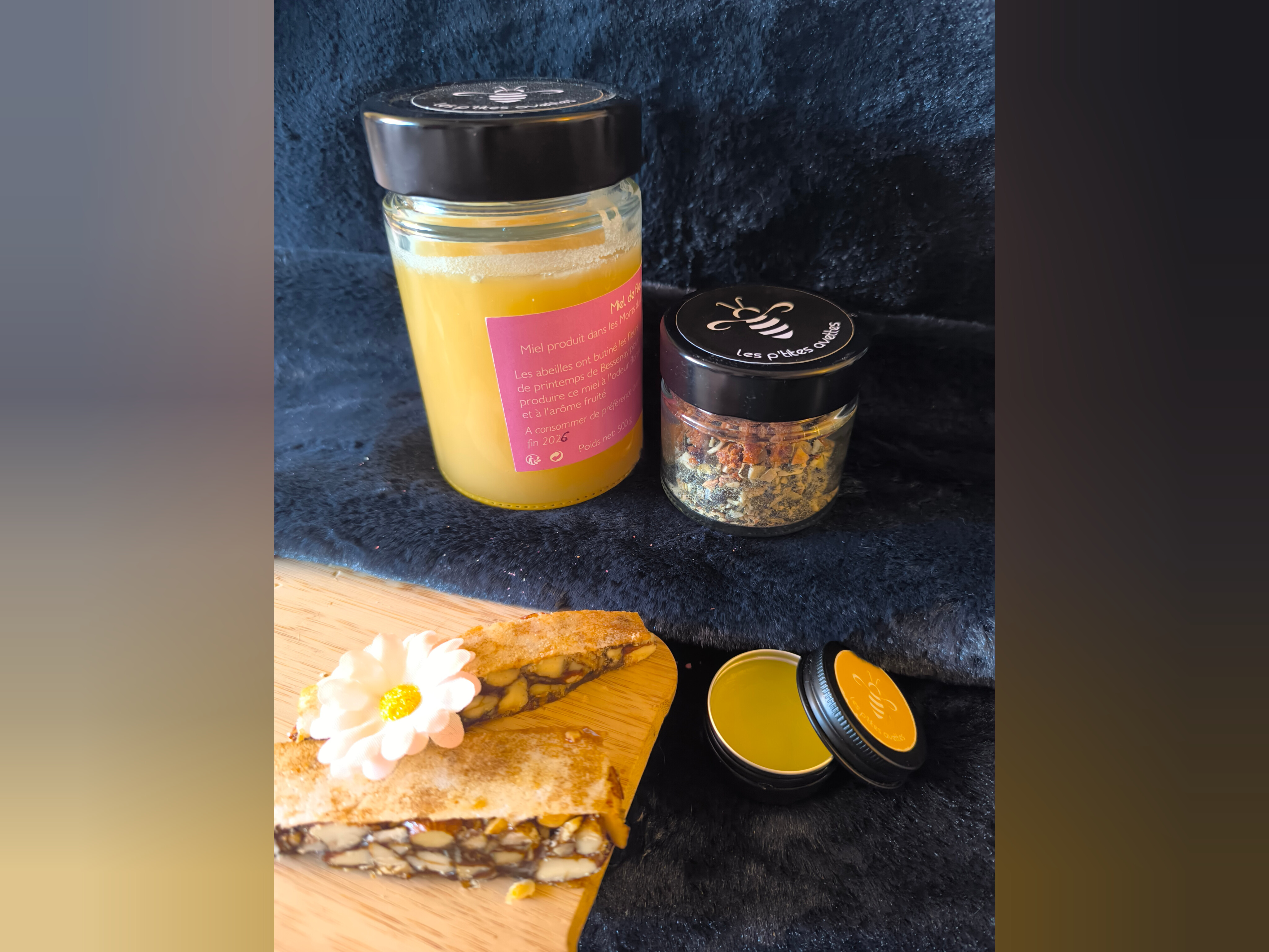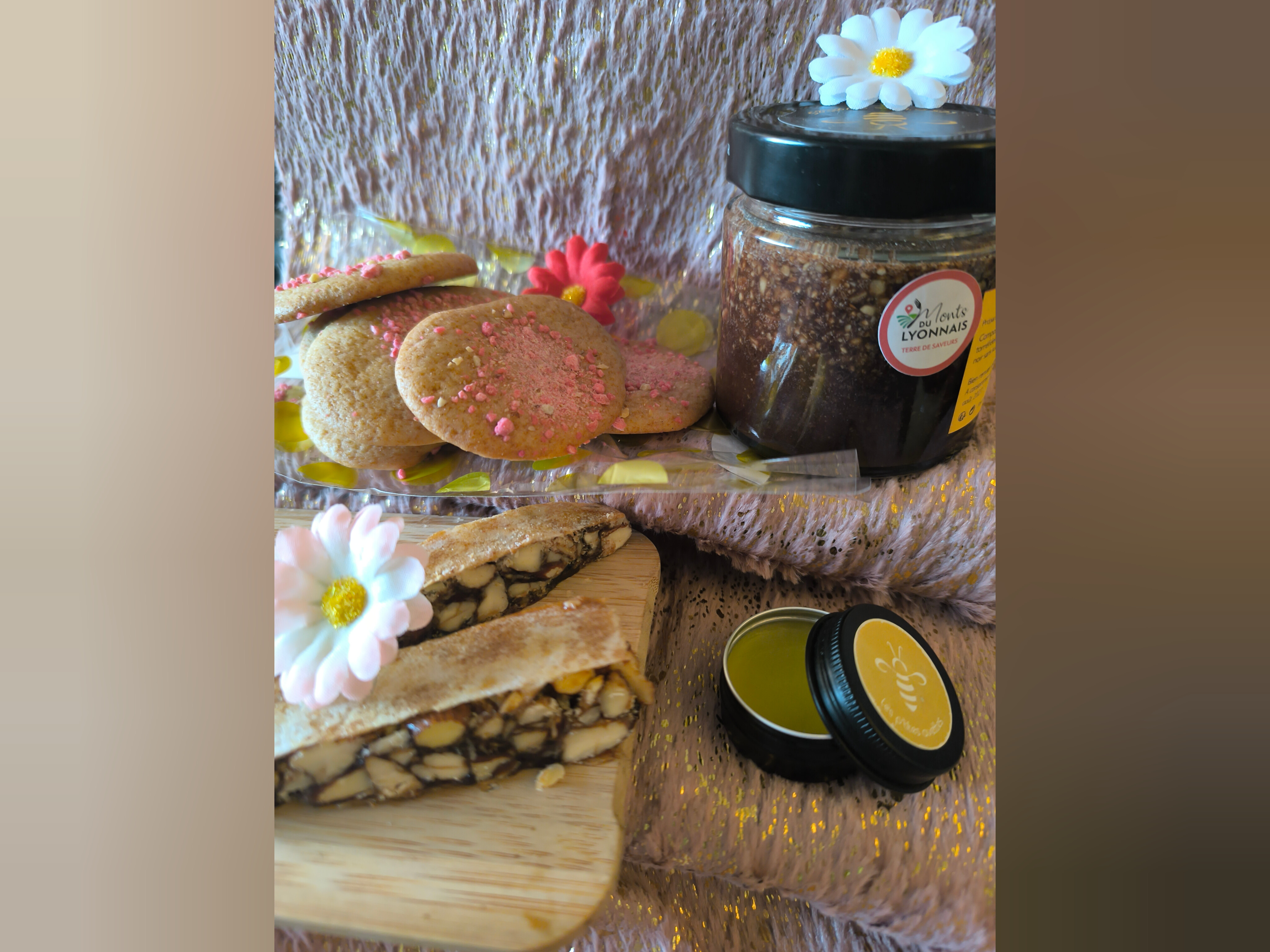 Des textures et des parfums pour se faire plaisir : sablés au miel, Choco’Buzz 230g, nougat noir et un soin baume des lèvres, harmonie subtile entre gourmandise et ambiance bien-être.