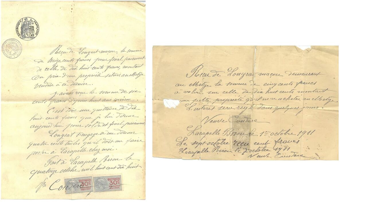 Ci-dessous, l’achat du lieu, en date de 1911 et 1918 (et non pas 1818 comme écrit par erreur sur le document), modeste maison avec une grange-étable et 4 hectares de terre aujourd’hui.