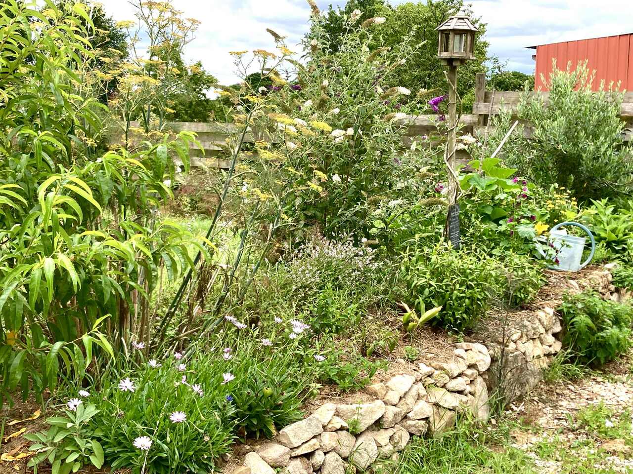 En 2023, une voisine nous vend son terrain d'une surface de 2000 m2 attenant au nôtre, j'y installe deux mandalas de plantes médicinales et une butte de plantes méridionales (thym, sarriette, sauge, hélicryse italienne, romarin) .