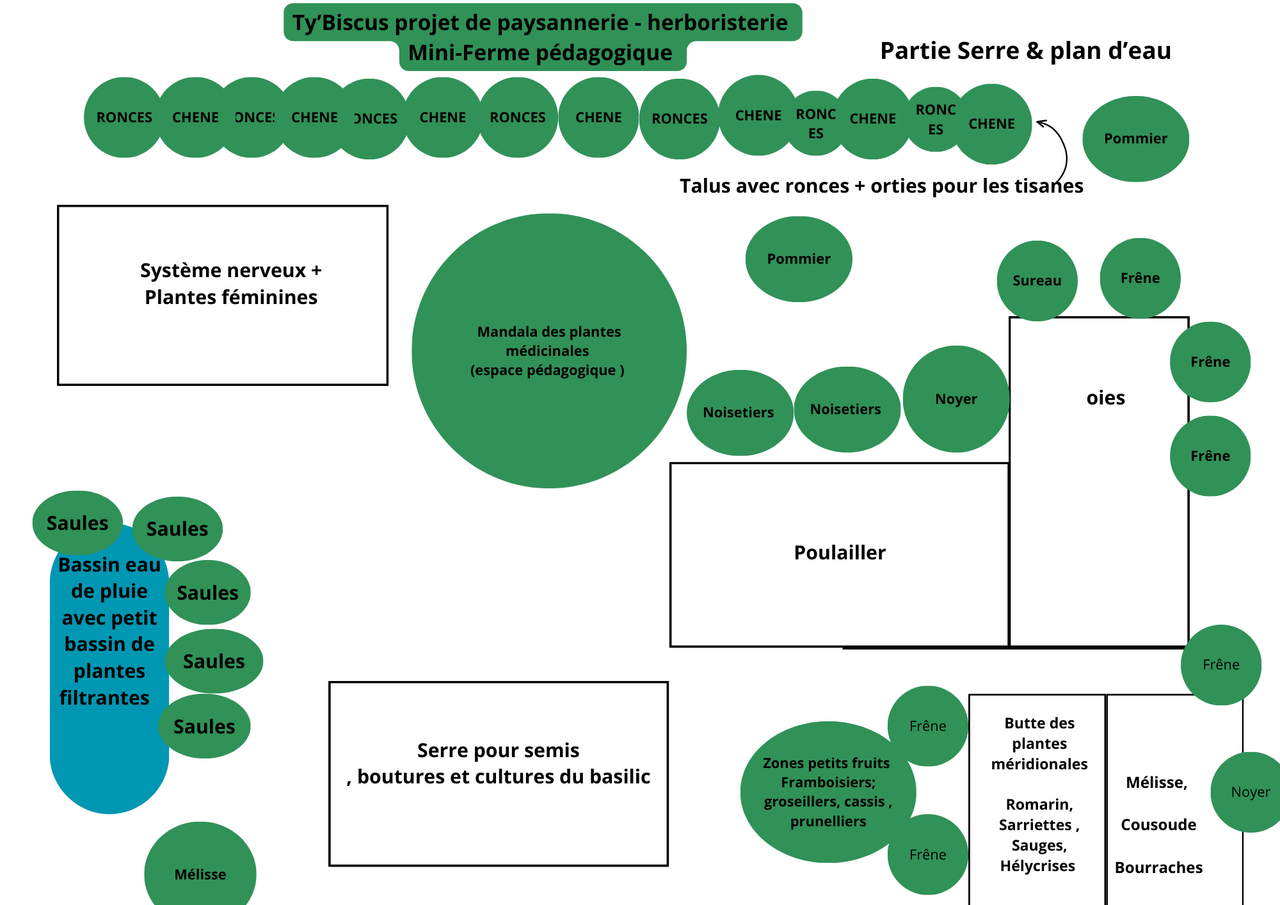 Voici le plan de mon terrain et les futures cultures, et un aperçu de ce que l'on trouve en abondance sur mon terrain :