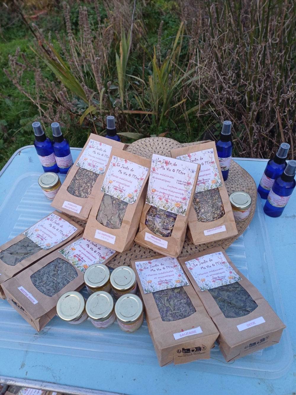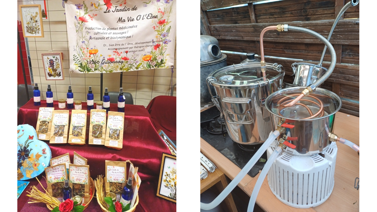 Je cultive et cueille plus de 55 plantes médicinales et crée des tisanes dont les recettes sont ma création et ciblées soutient de l'être dans ses failles physiques et psychologiques (compositions à thème avec plus de 55 plantes, ainsi que des eaux florales). C'est une petite production pas encore rentable ! Et je produit ma gémmothérapie, les teintures mères et les baumes, savoir potentiellement "enseignable" par la voie d'ateliers et petites formations.