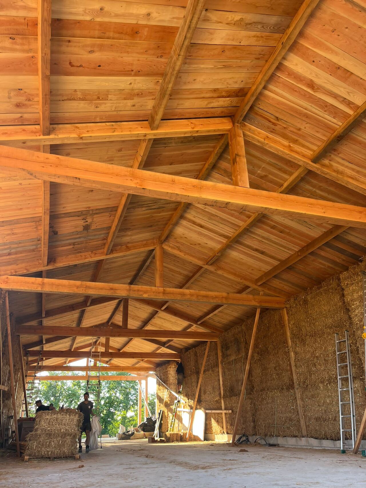 La construction du bâtiment a bien avancé. Le terrassement a été fait en début d’année (janvier, février) . S’en sont suivies, les fondations (avril), la dalle (mai), la charpente (juin) et enfin l’isolation du toit avec des petites bottes de paille et le montage des murs (juillet, août), cette fois-ci avec de grosses bottes de plus de 300 kg.