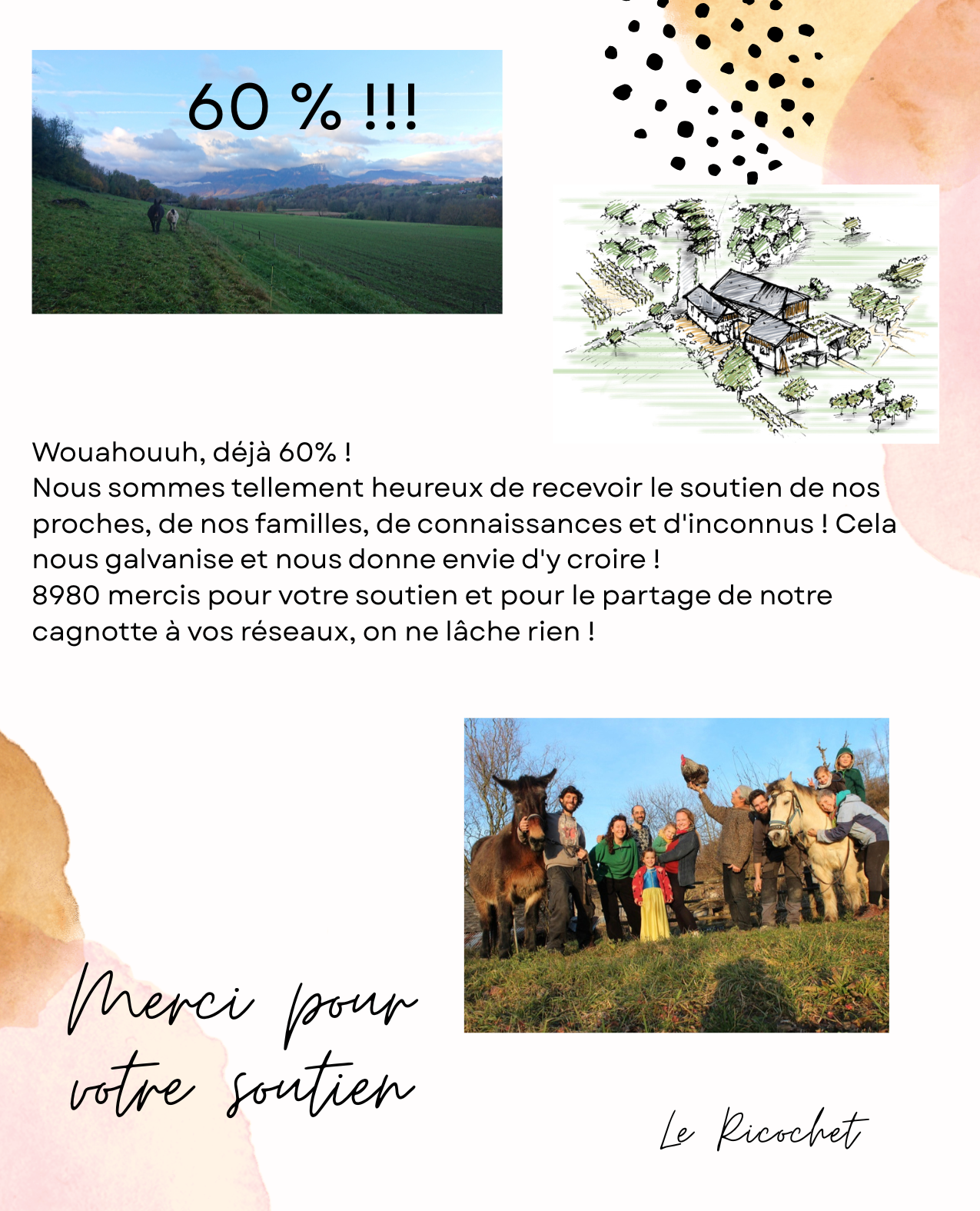 Merci ! En remerciement, venez visiter l'exploitation, essayez-vous à la traction animale avec nos maraîchers et repartez avec 1 bon panier de légumes à retirer en Septembre/Octobre.
