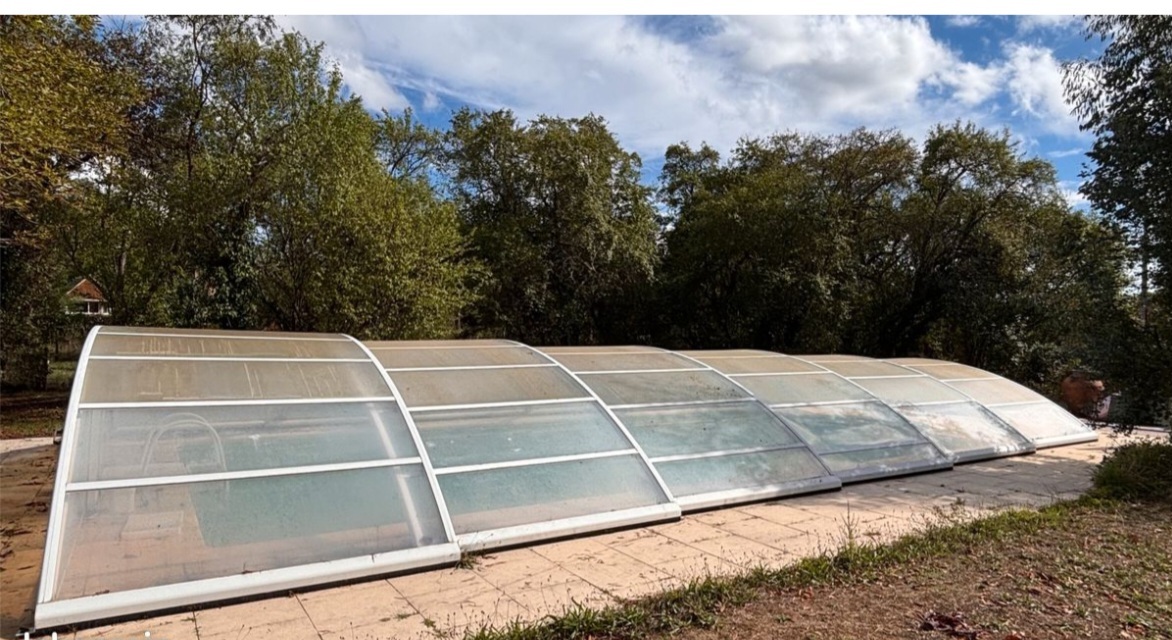 - Un toit en polycarbonate arqué — récupéré d'un abri de piscine — couvrira la structure. Monté sur roulettes, il peut être déplacé. Son point haut est au niveau du sol naturel : la serre est invisible depuis la parcelle.