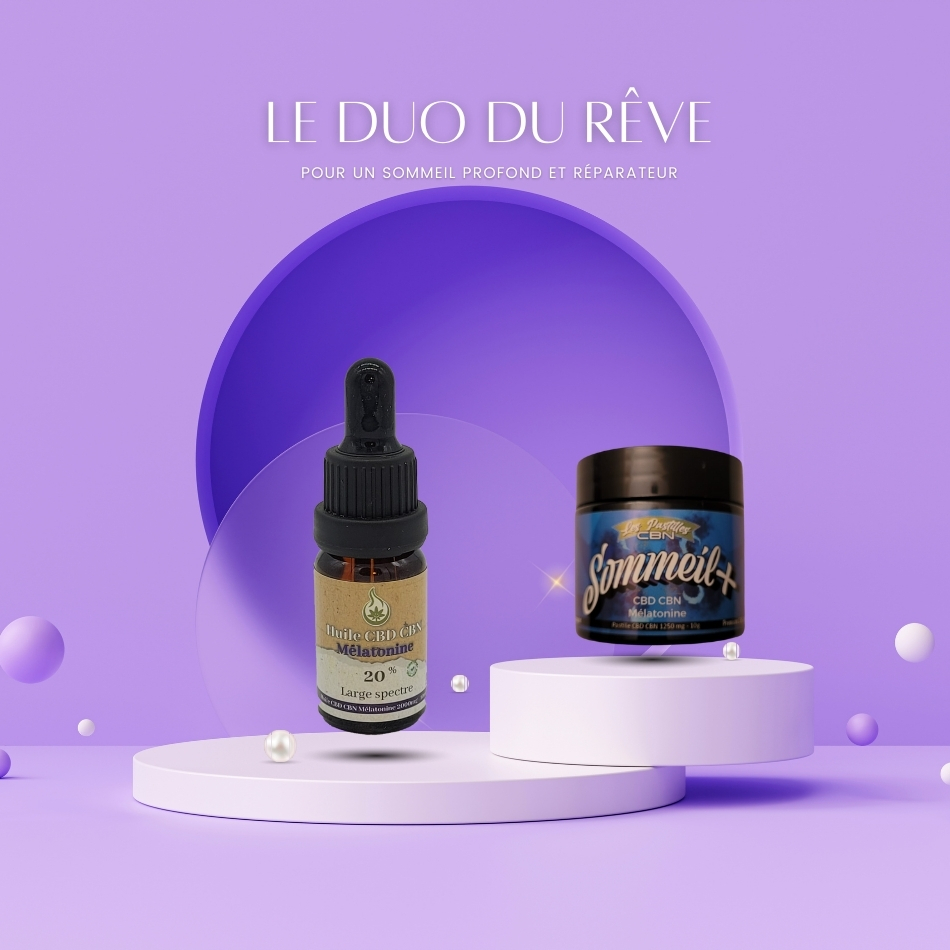 Besoin d'un Sommeil Réparateur ? Découvrez Le Duo du Rêve pour un sommeil profond et réparateur. Pour vous remercier de votre soutien, toute l'équipe YourMood vous propose de découvrir notre Duo du Rêve. Cette offre comprend : - 1 Huile Sommeil CBD/CBN/Mélatonine 20% - 1 Boîte de Pastilles Sommeil+ - Un bon d'achat de 30€ dès 50€ d'achats, valable sur notre site internet www.yourmood.fr - Une mention sur notre page Instagram @yourmood.f