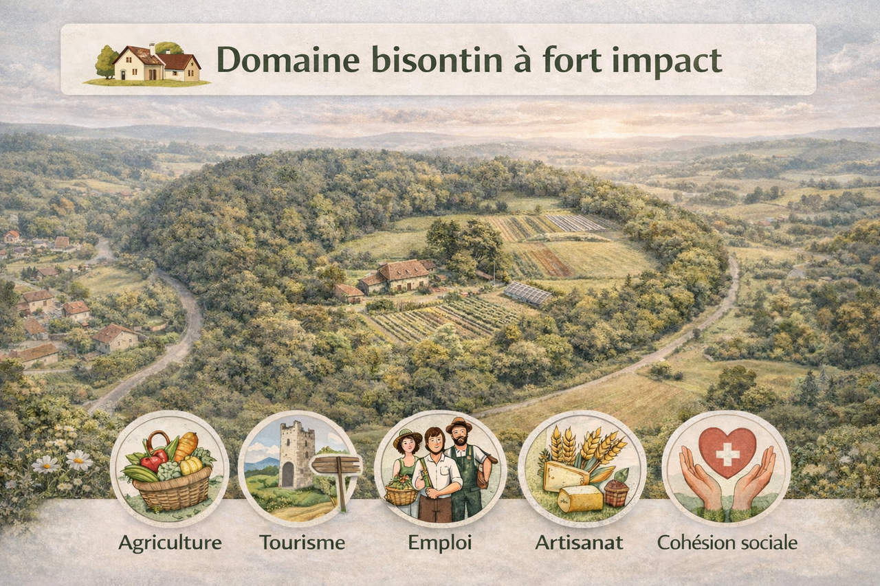 Installé à Besançon, sur le domaine historique contenant le Château Grobost, le projet ambitionne de redonner vie à un patrimoine agricole et naturel unique pour en faire un lieu d’innovation rurale et urbaine.