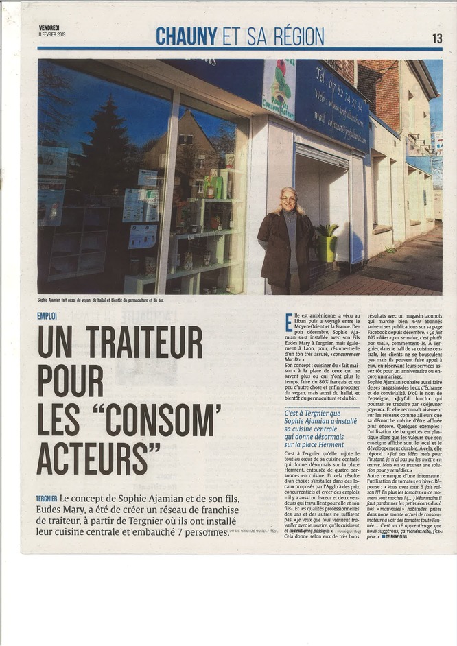 C’est Sophie Ajamian, maman du jeune entrepreneur Eudes Mary qui régale. Elle puise ses inspirations de divers Pays, elle propose une alimentation équilibrée et elle réalise aussi des plats sans gluten, sans sucre, sans lait, sans œufs, végan reconnaissables aux pastilles de couleurs. L'avantage est que des consomm'acteurs de divers modes alimentaires ; par ex des collègues qui veulent acheter leurs déjeuners; peuvent trouver en un seul lieu les plats qui leurs conviennent à chacun, sans avoir à courir plusieurs boutiques pour se procurer ce qu'ils aiment.