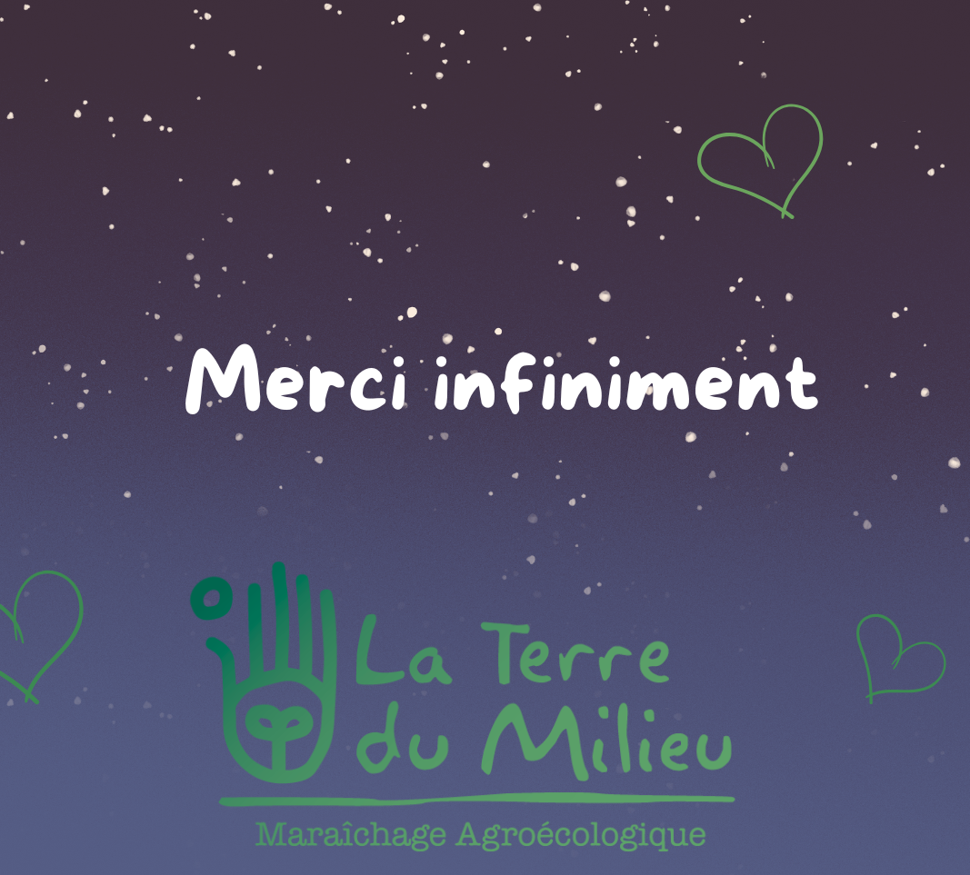 Pour 1000 euros, déjà Mille Merci!!!!!! Vous aurez droit à un brunch pour 2 personnes dans un resto local (prévoir un dimanche). 10% sur vos achats chez nous toute l'année 2026 ou un bon de réduction de 40 euros chez nous. Vous bénéficierez aussi d'un panier de légumes, d'un verre offert sur le champ, un sac à l'effigie de La Terre du Milieu, une bouteille de jus de pomme, un sachet de graines et votre nom sur le panneau des donateurs. MERCI